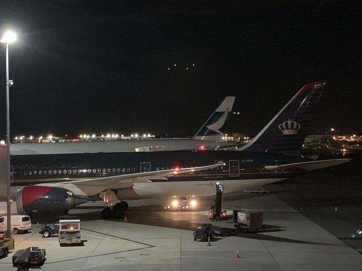This evening AA's MXP departs gate 34, BCN from 46, EZE from 34, MAD from 31, as well as TLV from 47. I'm sure there are more. I appreciate these are departures rather than arrivals, but the aircraft still has to be there.