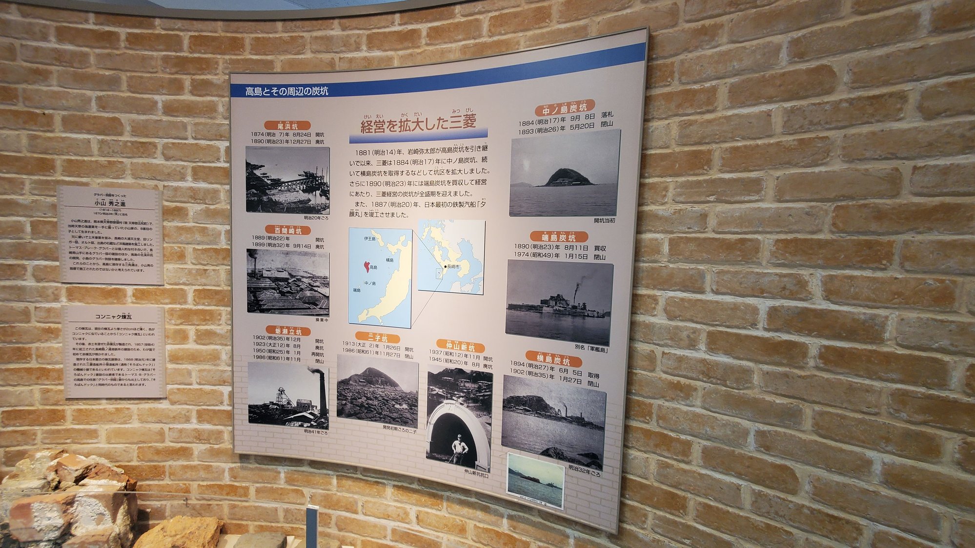 There is a small mining museum at Takashima including small scale model of Gunkanjima. There were several mining islands off the coast of Nagasaki. The below picture is the list of mining islands off the coast of Nagasaki owned by Mitsubishi. Yokoshima, the one on the right bottom in the picture below, is an interesting one. The mine in Yokoshima closed in 1902. In 1965 sinking of land was observed at Yokoshima. Today, a big portion of Yokoshima has sunk into the ocean, and only a 160 m (490 ft.) portion of Yokoshima is left sticking out of the ocean.