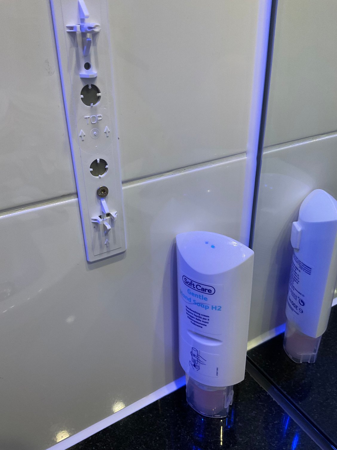 Bathroom: has 2 light settings aka deep aqua blue and normal white