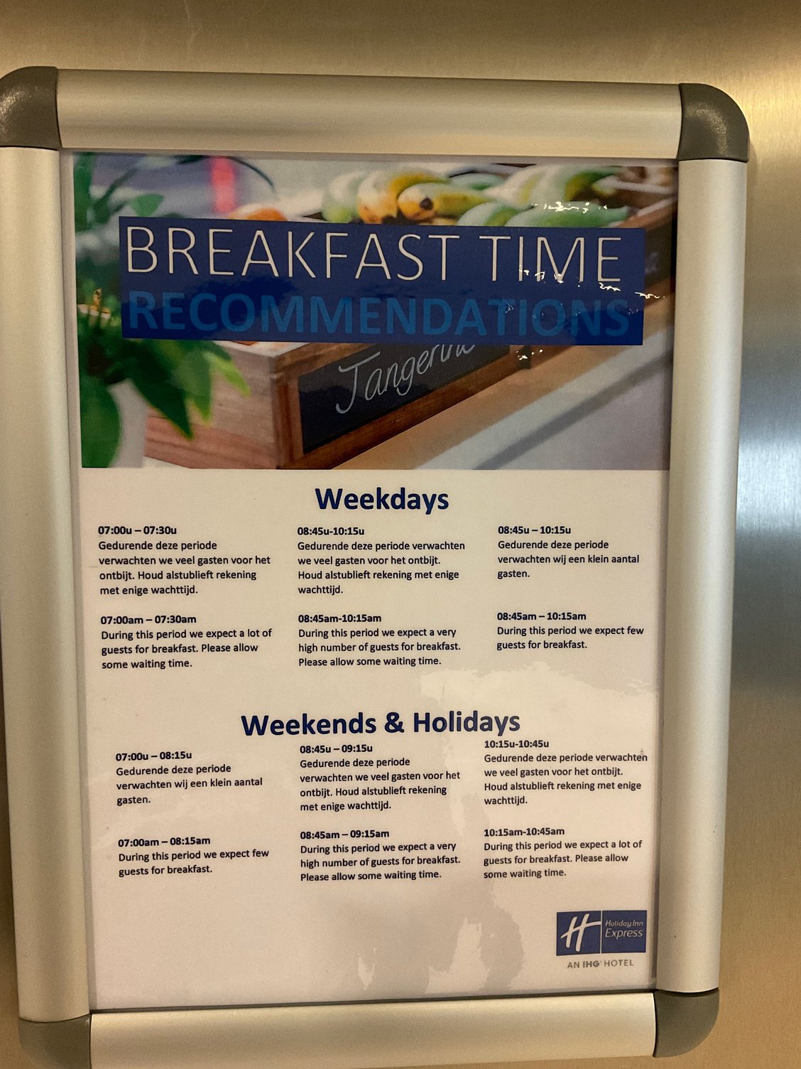 During peak travel times, guests must inform reception in advance their preferred time slot to have breakfast and will be handed a colour coded card timeslot to manage crowd influx in the breakfast room.