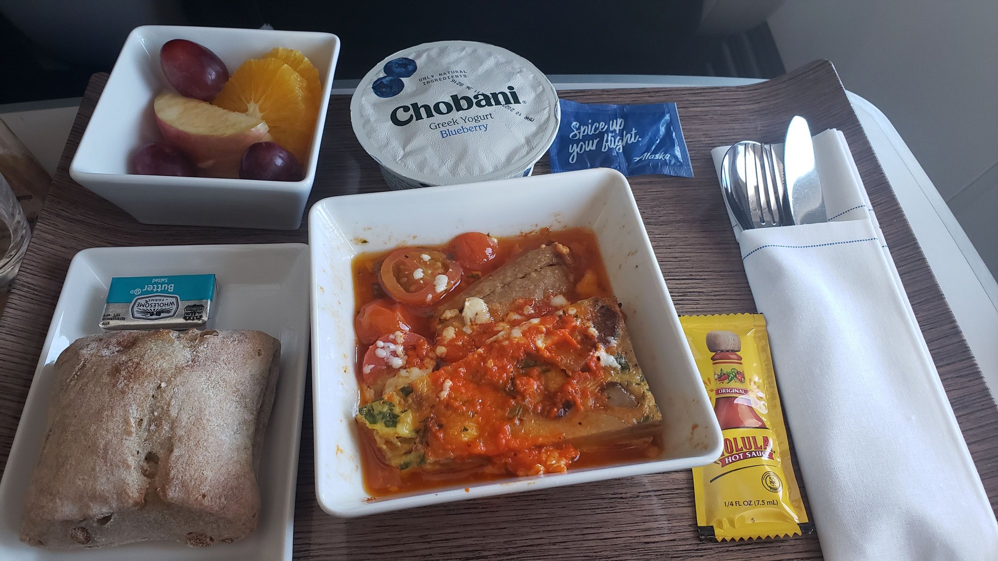 There wasn't a ton of cheese which is perfect for me. The frittata itself was good (not great) but it was piping hot which was what I really wanted; the tomatoes were good too. I had one bite of the sausage; I like maple syrup as much as the next person, but I hate when they try and always sneak it into otherwise savory dishes -- otherwise, the texture was good. Had some of the fruit and one bite of the roll, which was sweet so I didn't have any more. I didn't even touch the yogurt other than to offer it to my seatmate. Not in the picture is my spaghetti squash and cucumber which was perfect. I am stuffed and won't eat until we land.