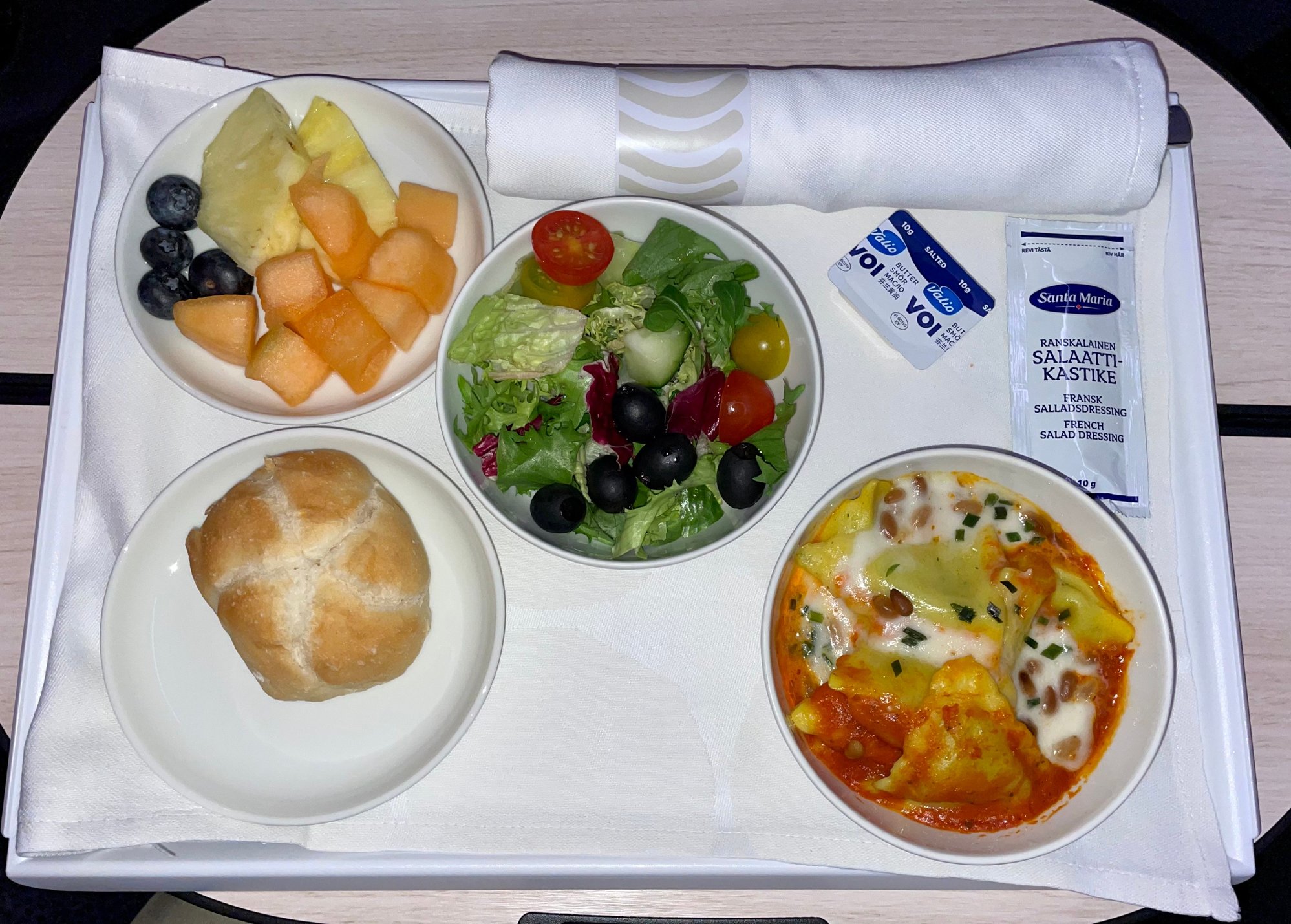 I was served the second meal 90 minutes before landing. Raviolis that tasted as if they came straight from a tin can. I hope that is not the case. I would not serve that kind of tsteless low-quality junk even in Economy. Some lettuce, 2 cherry tomatoes and a few pieces of fruit as well as a small white breadroll that was heated this time.