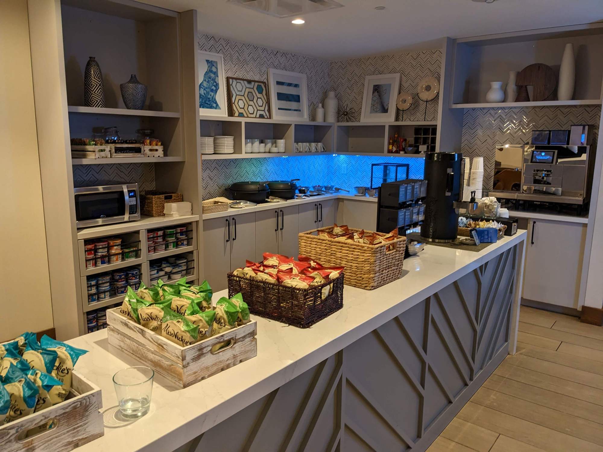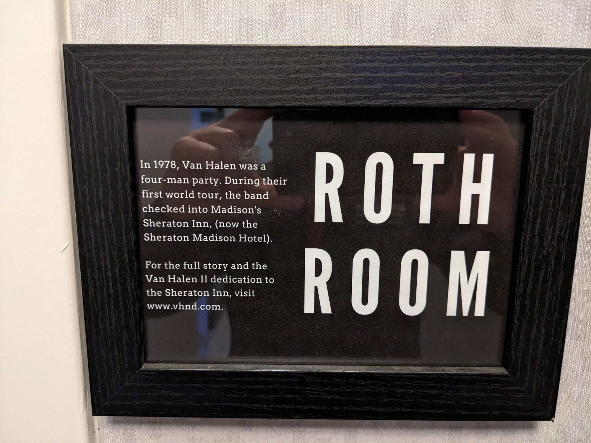 Completed 1-night paid stay (weeknight) earlier this week. Booked standard 2 Double room with anticipation that my business colleague would be joining me for the stay. I messaged the hotel two days prior to check-in after learning that his plans changed and I would be only occupant - requested change to 1 King. Obliged, and "upgraded" to room on club lounge floor, which is the 7th (top) floor, which is accessible via key only from elevators. Judging by the number of 'Do Not Disturb' hangers on doors, seemed to be considerable number of occupants on this floor (including all 3 other rooms in my cluster). As noted however, the actual (current) lounge is on the first floor. There is a conference room labelled the 'Roth Room' on the 7th floor (which apparently is named after David Lee Roth - see photo below) which I'm guessing was the lounge in a previous iteration. FWIW - evening lounge offerings included chicken tacos with fixings and cookies; breakfast included cheesy scrambled eggs, sausage, and oatmeal; soft drinks, water, chips, and granola bars available perpetually. Also has espresso machine; however, it was non-operational for me 3 out of 4 attempts (and seemed to be finicky for the breakfast attendant also).
