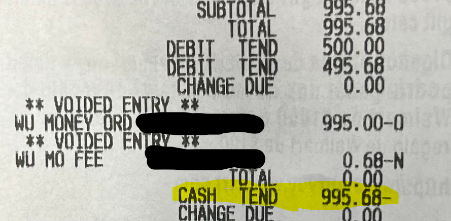 Two days ago, I attempted to buy a $995 MO at WM using 2 USB VGC. Payment went through without any issues but they were out of paper so they voided the transaction. They didn't want to proivde the receipt to me but I took a picture. They said the money will be credited back to my cards but I just checked the balances and they are still 0. The receipt has a line item for 'cash tend' (highlighted in yellow on the pic). Does that mean I was supposed to receive the refund in cash?
