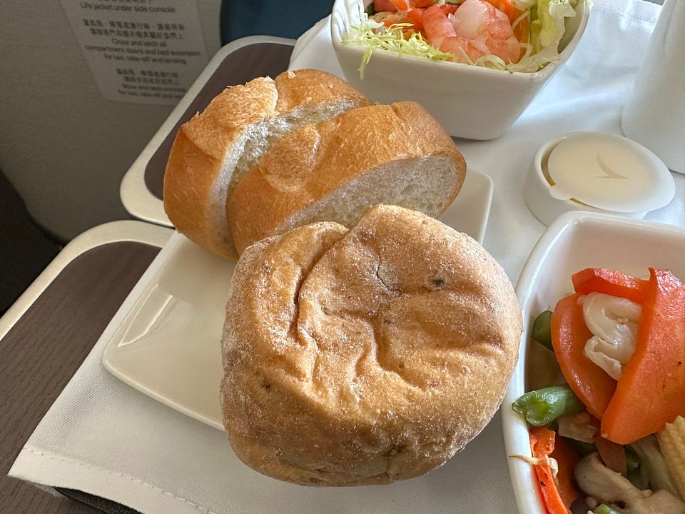 Everything was served in one tray with no separate linen service. Breads – two slices of garlic bread and one soft olive roll – were pre-placed at each tray. Not sure what is the rush! Meal service was done within forty minutes after takeoff. It was okay between Hong Kong and Taiwan/the Philippines/Hanoi, but for Thailand, there should be a separate mixed nuts service with linen. The service was rushed with no reason.