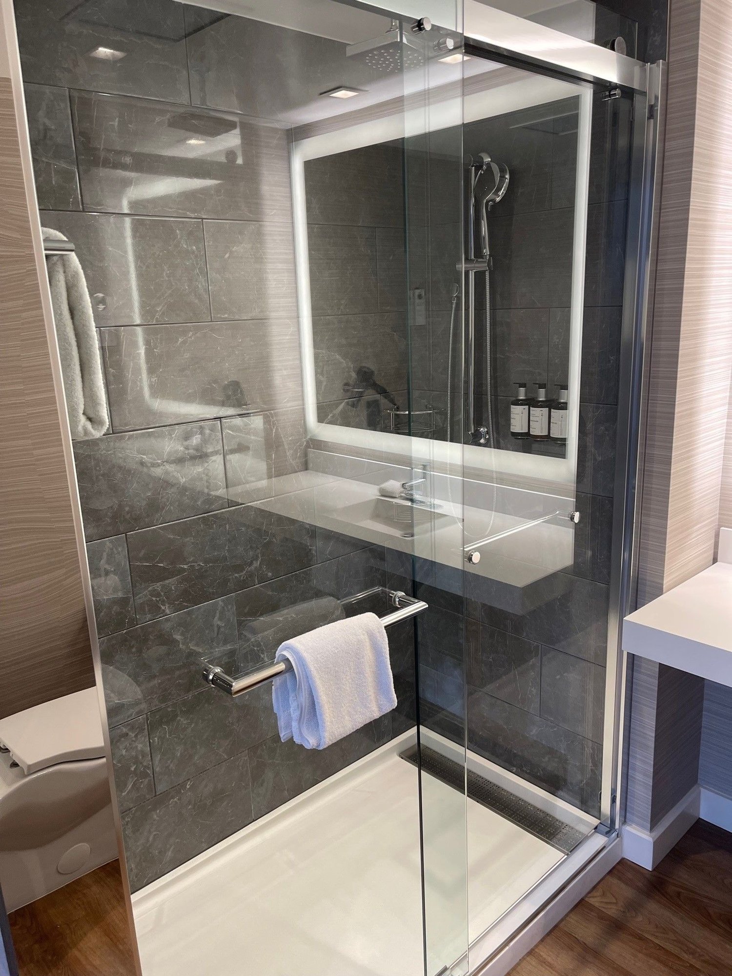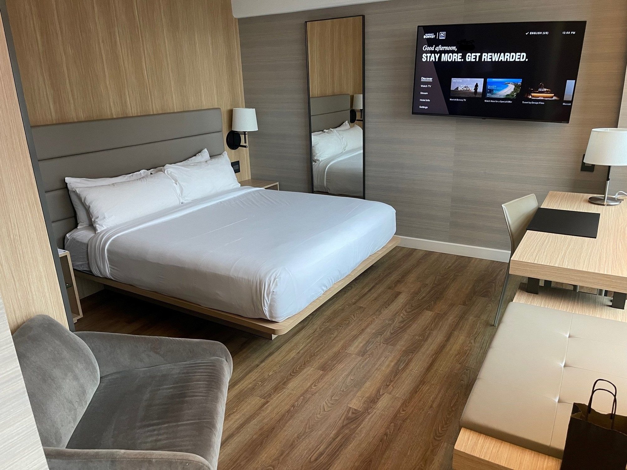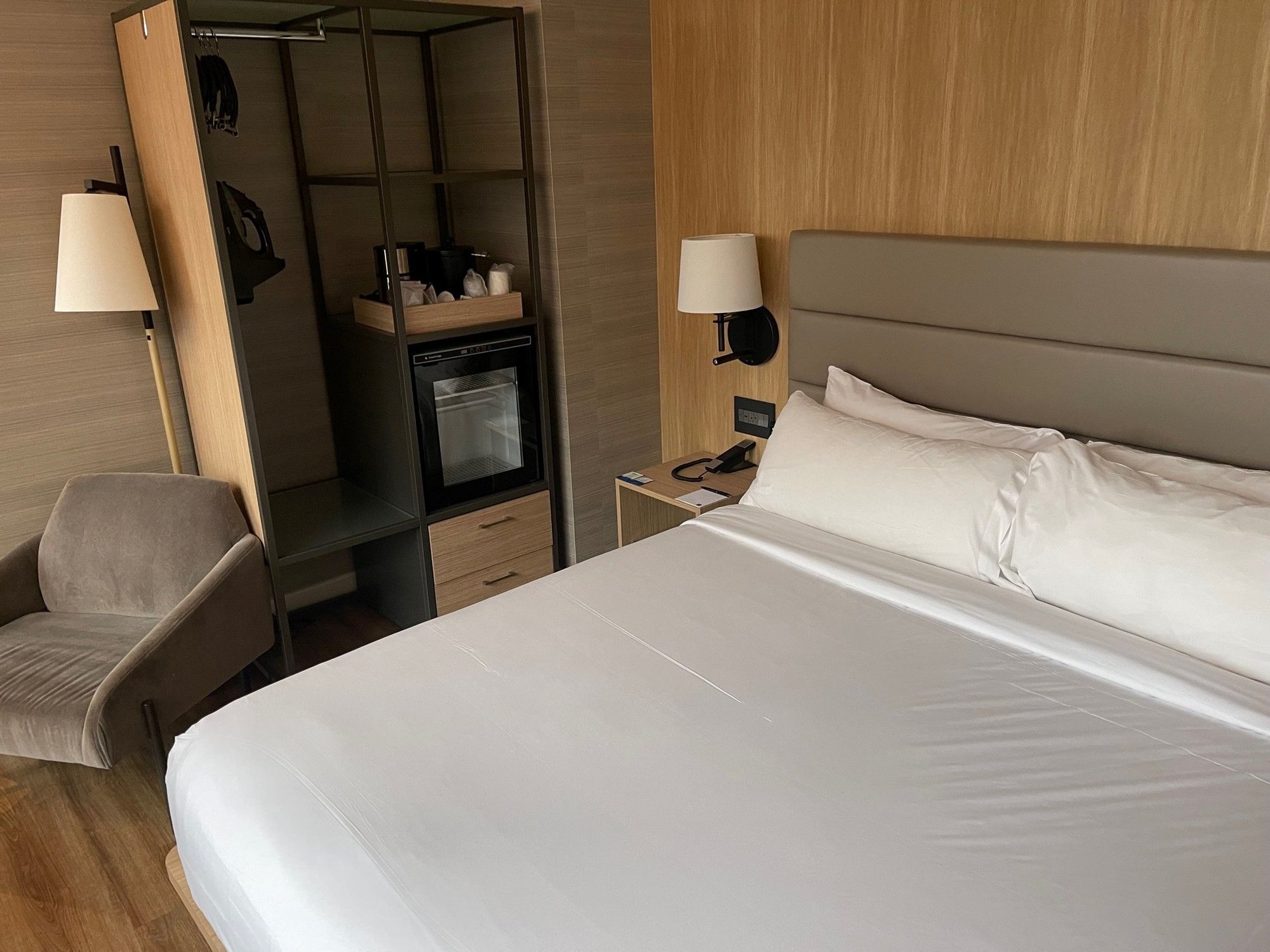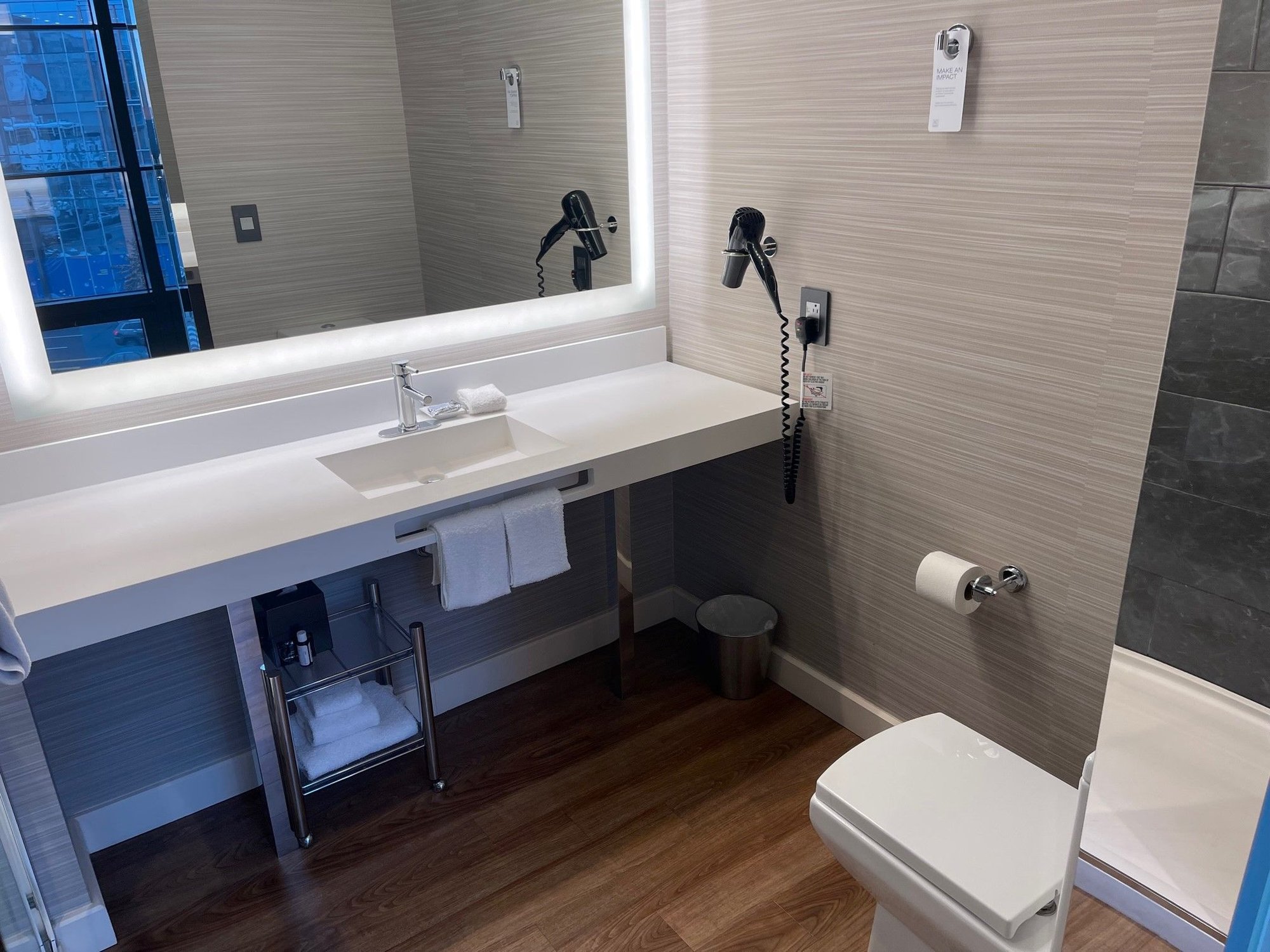 Bed is comfortable. 2 power outlets and 2 USB on each side of the bed, which is great. HVAC worked well. Small hinge windows are able to be opened for fresh air, which was also great. Housekeeping stopped by after the first night offering service, which was nice. Just asked them to refresh the towel supply, but seems they would have done the whole room if I wasn't there. Bathroom setup was fine. Spacious shower and plenty of countertop space.