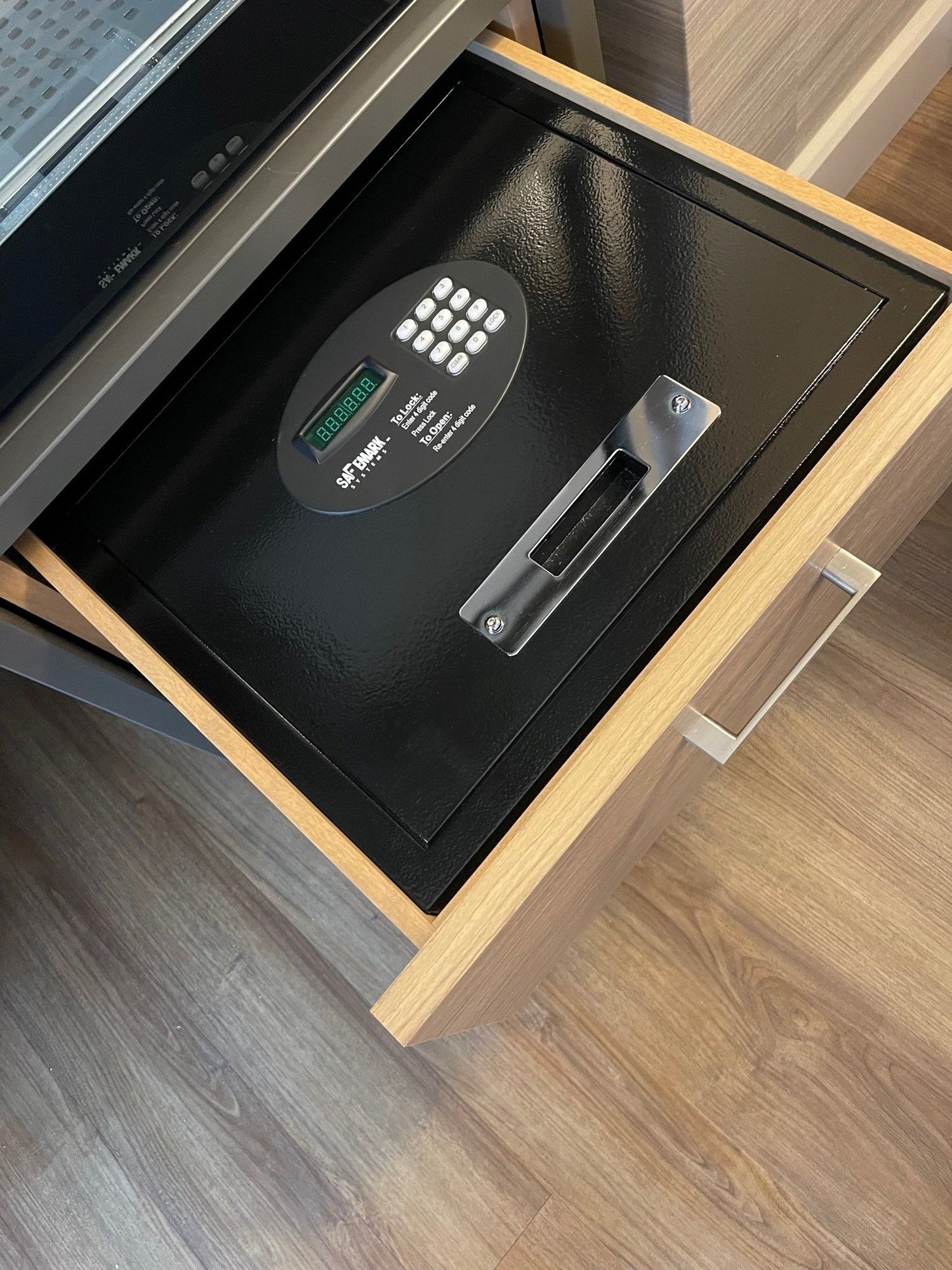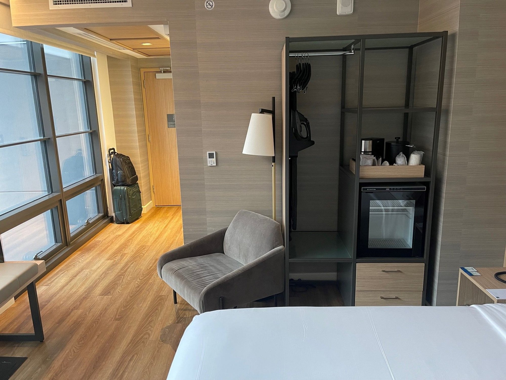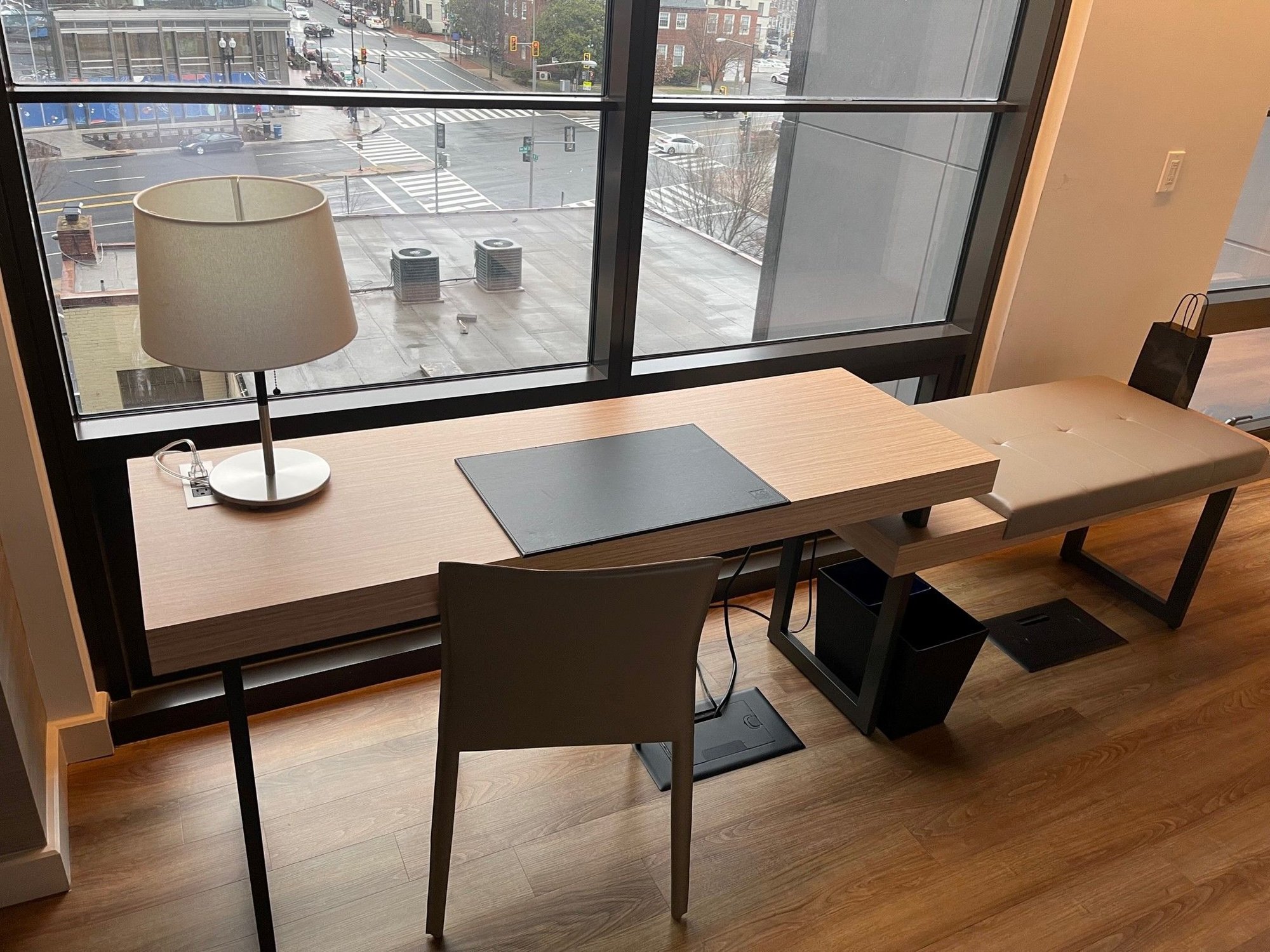 Very happy they have do a dedicated desk area ,though wish they had a couple more power outlets there. (2 power, one used by desk lamp. 2 USB). They also have the open clothes rack setup instead of an enclosed closet. Mini fridge in the same unit, along with a safe in one of the 2 drawers. Coffee service on a heavy tray on a shelf as well, but no power outlets there. So ended up lugging the setup to the bathroom each morning. Cafe Divino brand coffee, which I haven't seen before - tasted fine.