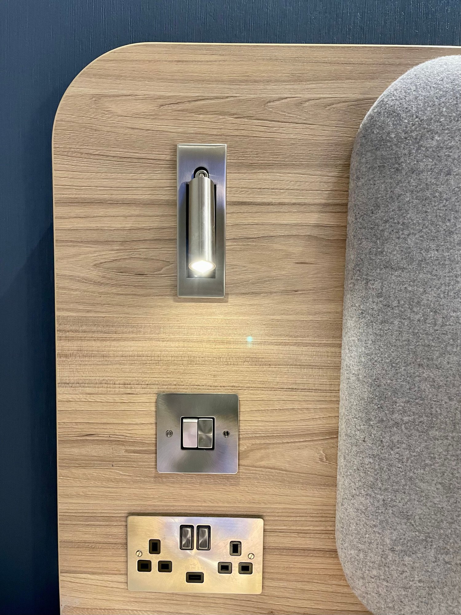 Sockets and usb sockets next to bed.