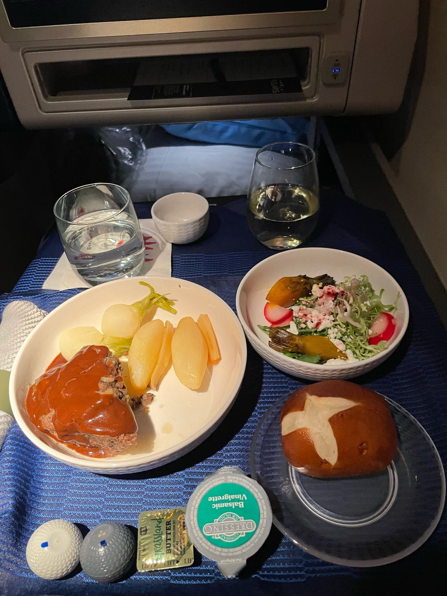 Tonight’s menu. We ended up having a 45 min ground delay to offload bags so I was chatting to the FAs about the rumor that garlic bread was back. They looked and were happy to confirm and even showed me the bag they were catered in. They seemed to be knots which looked good.