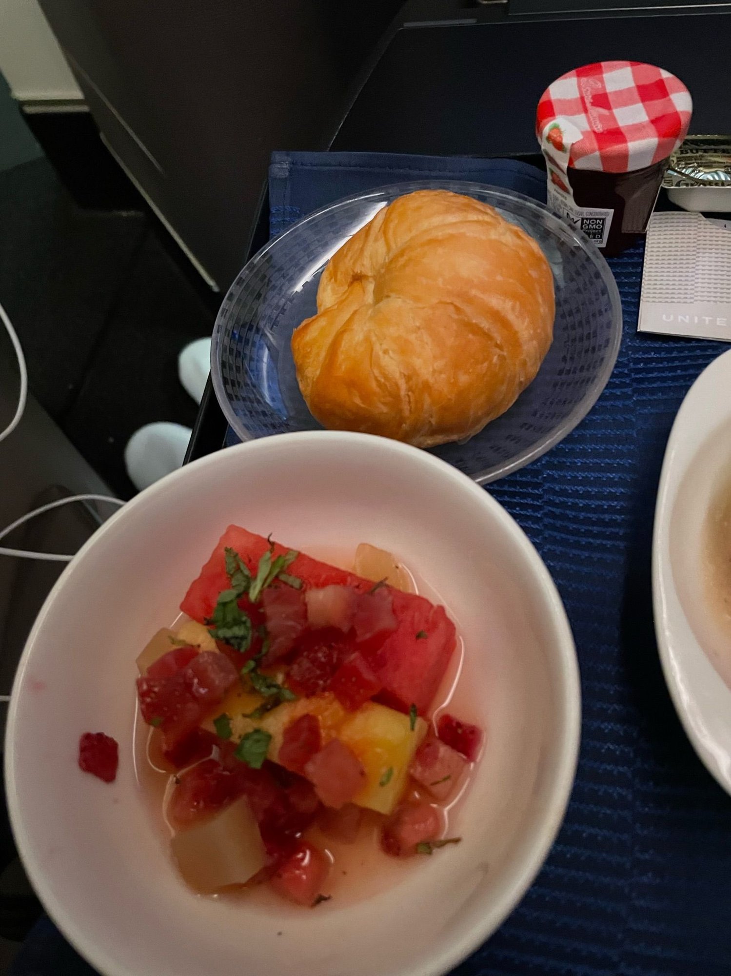 Then the meal was served. United has definitely stepped up their salad game. The food was fine but nothing remarkable. Note for whatever reason garlic rolls didn’t end up being served. No idea why, but wanted to get to sleep ASAP so didn’t say anything. The crew were great during meal service and proactively offered refills or to switch drinks when a new course (nuts, tray, dessert — would it be too much to ask for a separate appetizer UA!!!) came.