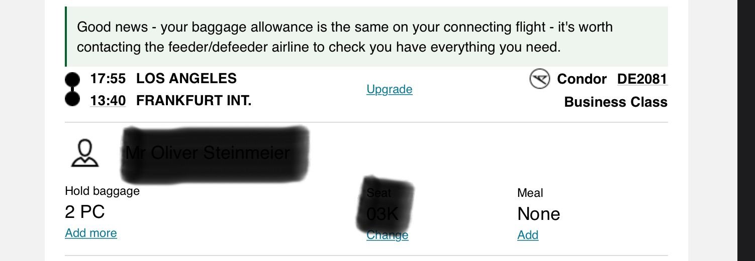 Condor revenue ticket in business class: the email confirmation says that it includes 2 pieces (bags) in hold.