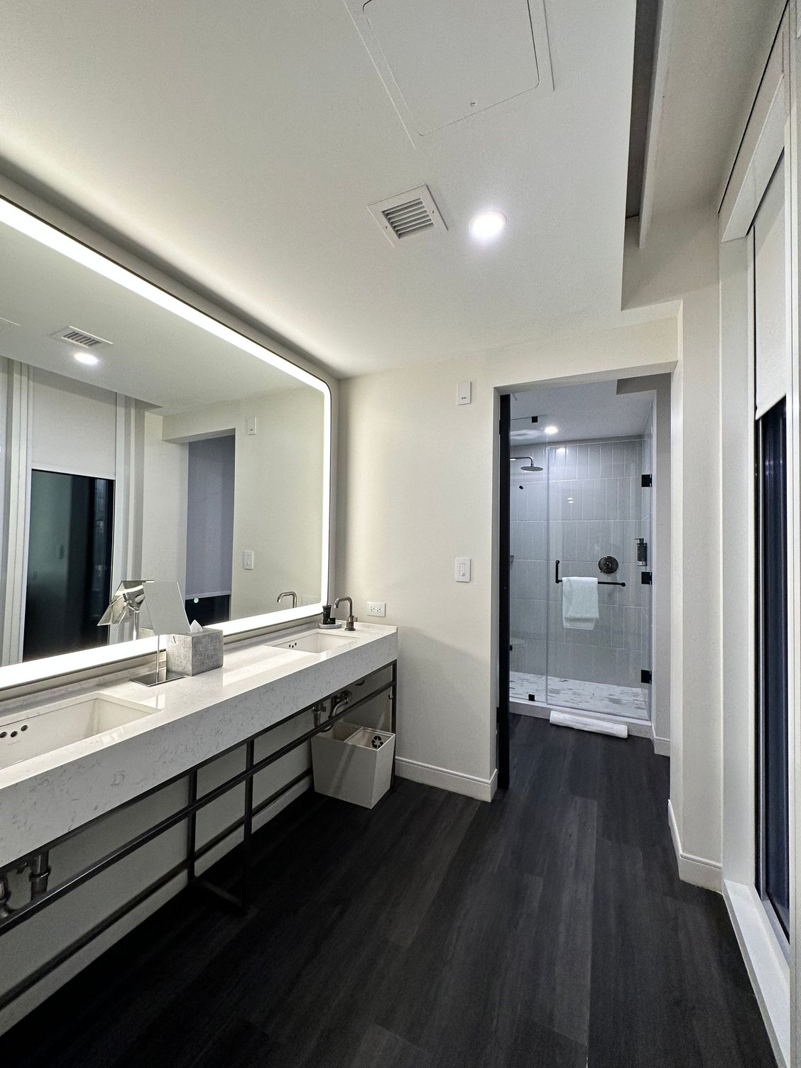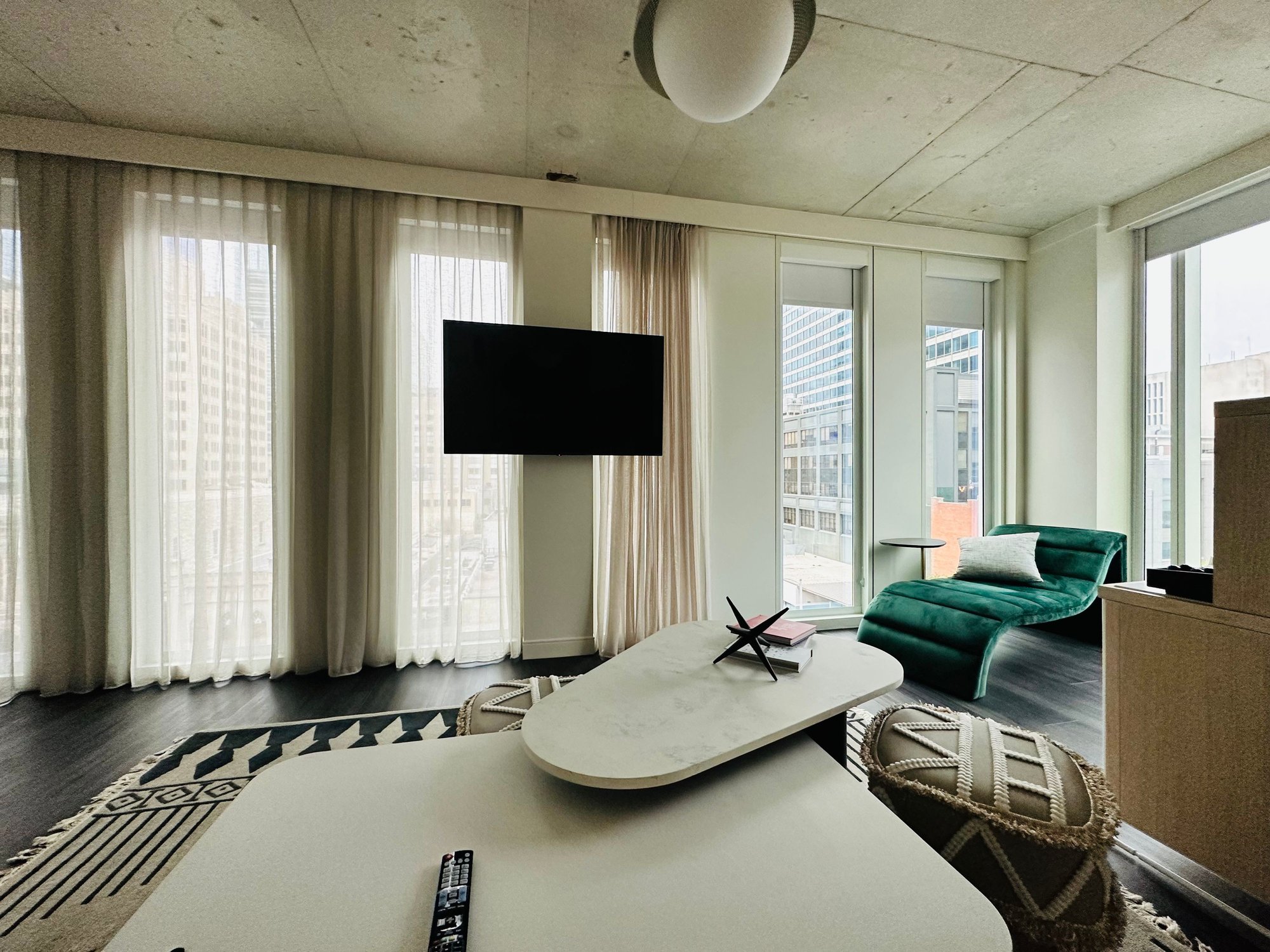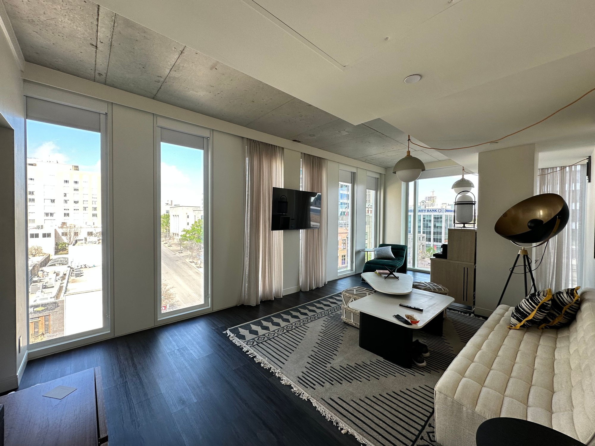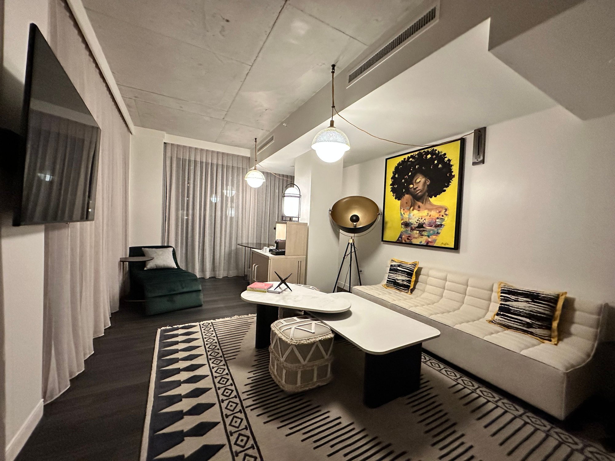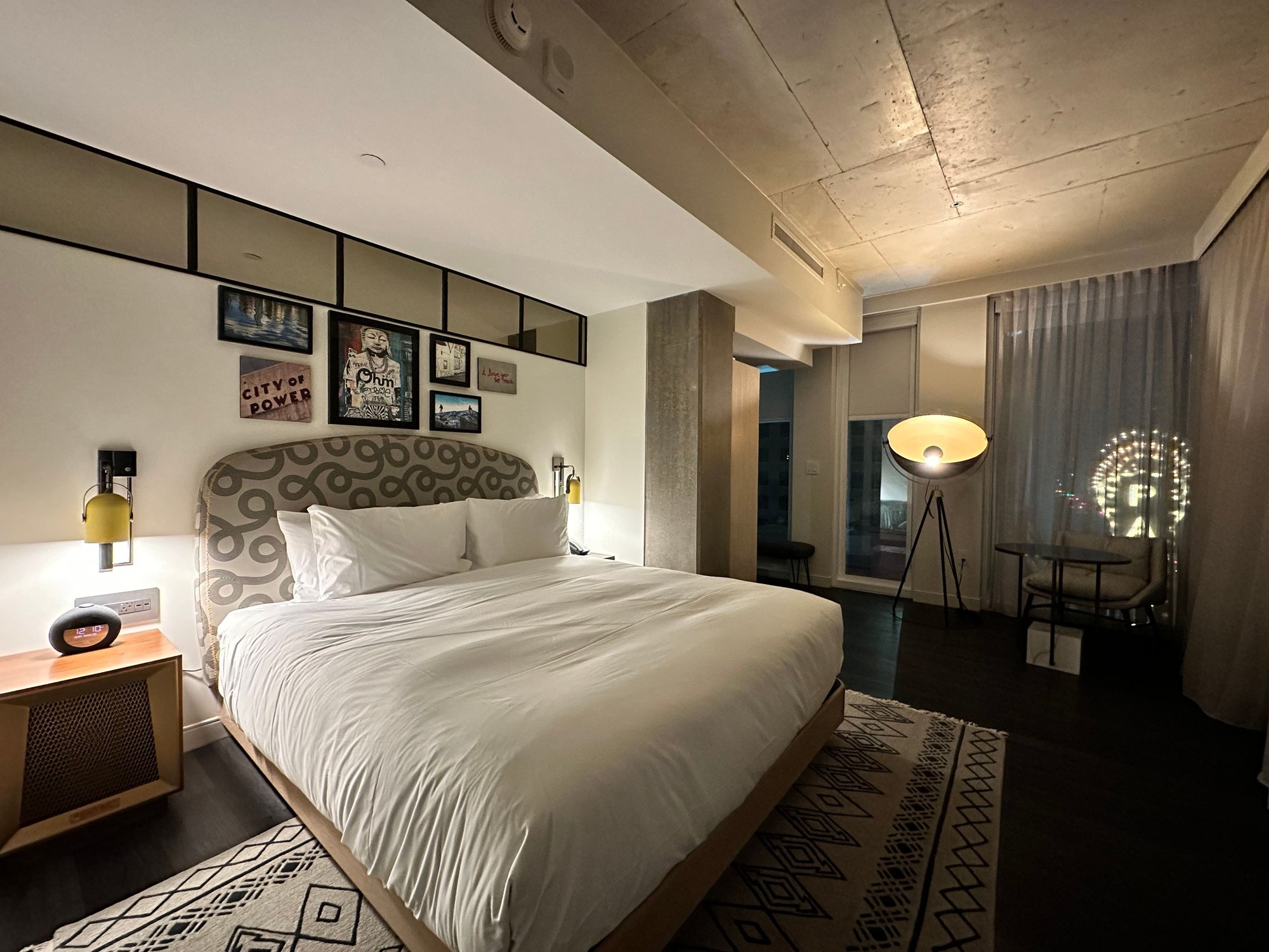 We arrived late, and perhaps I should have checked in online earlier, or perhaps this particular suite type are only on the lower floors, but we got floor 6. Complete opposite of what I requested for a higher floor. In any case the room is modern and unique with tons of natural light as it has over a dozen window panels. It is spacious and packed with charging stations and outlets all over. Now, is it functional? Not very. The doors separating the bed room and bathroom are not solid doors so if you’re a couple and one is preparing or an early riser, then the room isn’t very good for that. In addition, despite the modern theme, the window treatments are all manual. That means you’d have to manually lower over a dozen window curtain/blinds if you want the whole room darken.