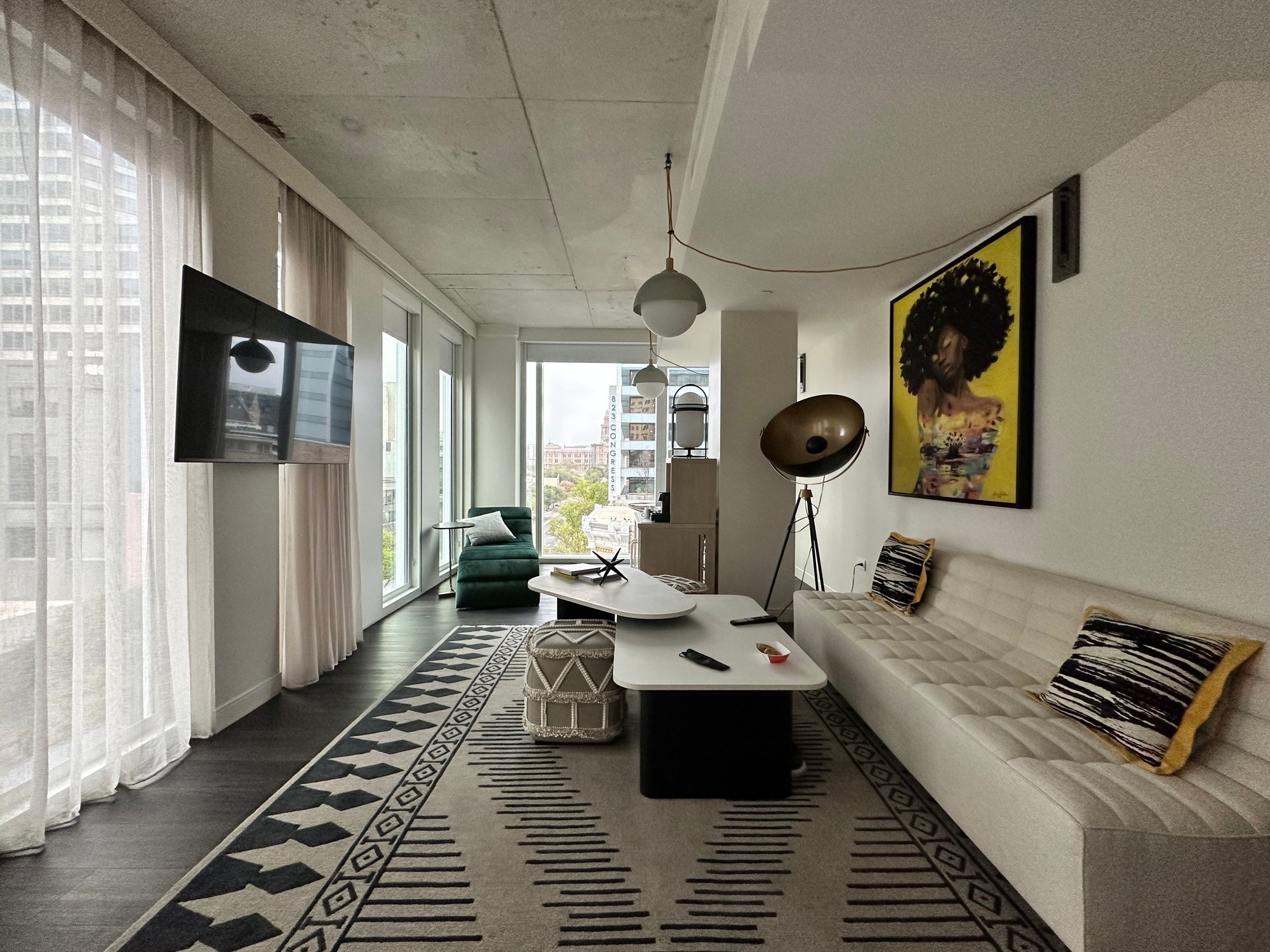 We booked the Congress suite to check out this new property in Austin. There’s not much information out there about the suites so I was excited to check it out. Location is close to 6th street, so if you’re looking for a hopping night activities on a weekend with places to eat past midnight then location would suit you. For some, it may actually be too wild. Given it’s location, half of the rooms will have nice view of the Capitol not to mention the fact that the building has 31 floors. I took the elevator up and took some pictures and the view up there was breathtaking.