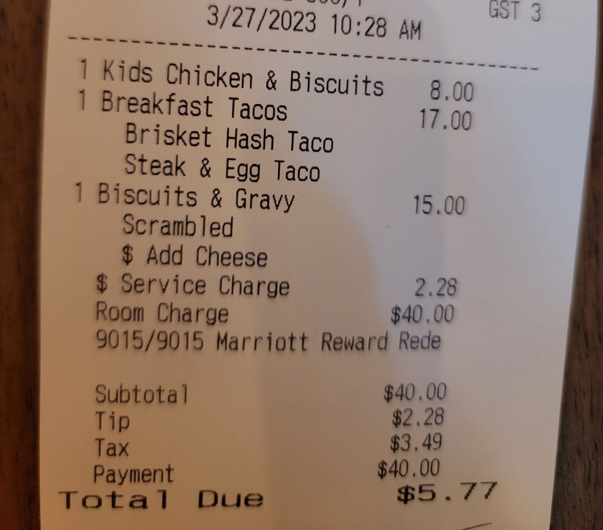 The breakfast vouchers cover $30 (continental breakfast for two), but you can use it towards anything, and you can stack the $10 F&B voucher with it. So the $40 covered the $15 biscuits & gravy with eggs, the $17 breakfast tacos, and the $8 kids chicken & biscuit (which includes fruit and a drink). A $2.28 "service charge" appeared on the folio, along with sales tax. I didn't ask about the service charge, but the server says it's added on when you use the Bonvoy voucher. So perhaps the $30 voucher really covers $27.72. Still, given the flexibility to apply it to anything on the menu (and given the relatively reasonable prices for fantastic food), I found it a great benefit compared to properties that only allow you to use the benefit for a sad pastry-loaded continental breakfast. Anyhow, on the food, the biscuits were freshly baked (the server warned us it would be 20 minutes, but he offered to bring the kid's fruit out right away, which worked great). Brisket on the brisket taco was on point. Breakfast potatoes with jalapenos and onions were perfect.