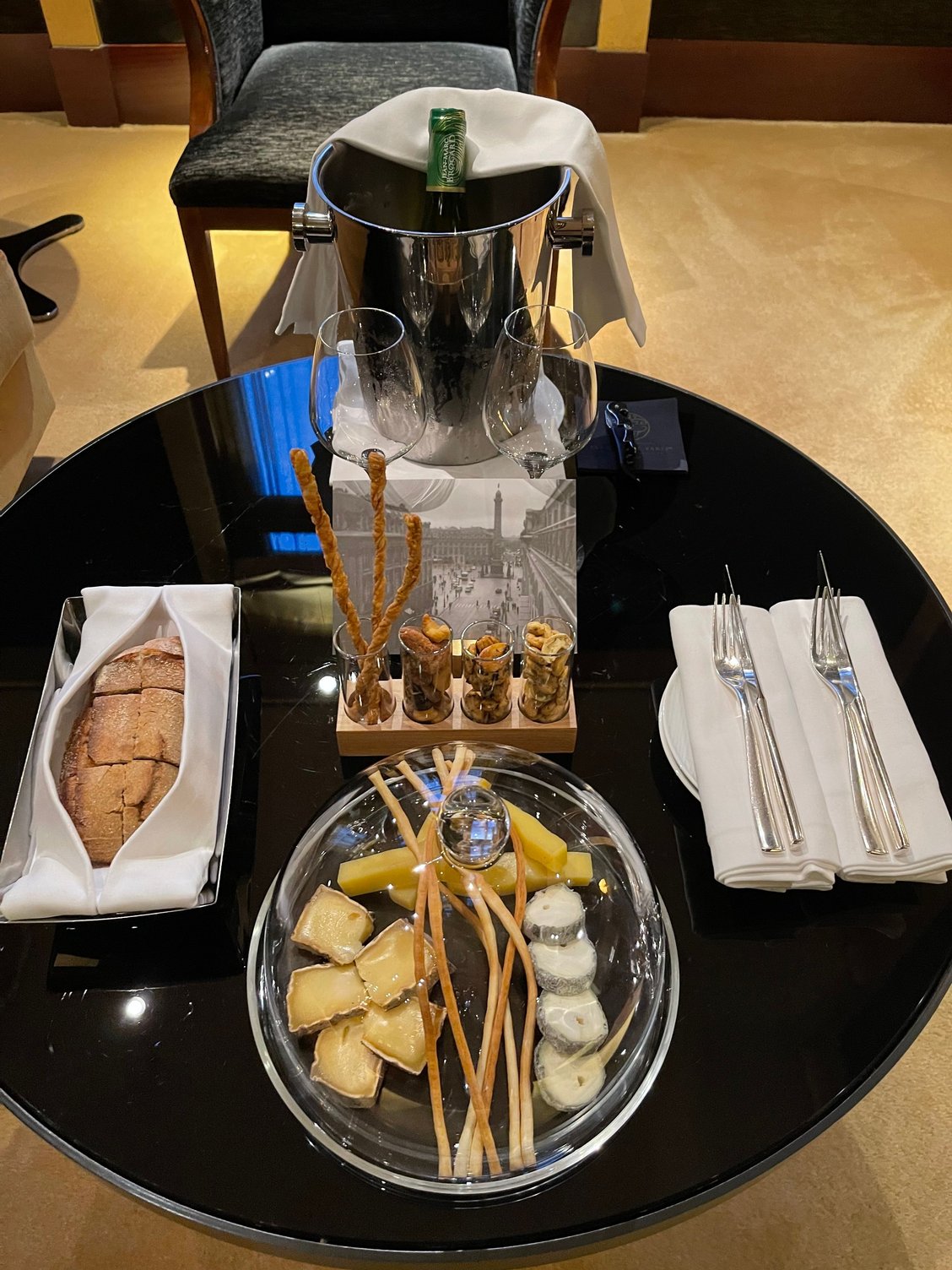 Welcome gift even better than last times with the usual bottle of wine (Chablis), almonds, cashews, welcome card from Rocio and for once instead of a few macarons or fresh fruits a large plate of cheese (love it being French) and fresh bread: