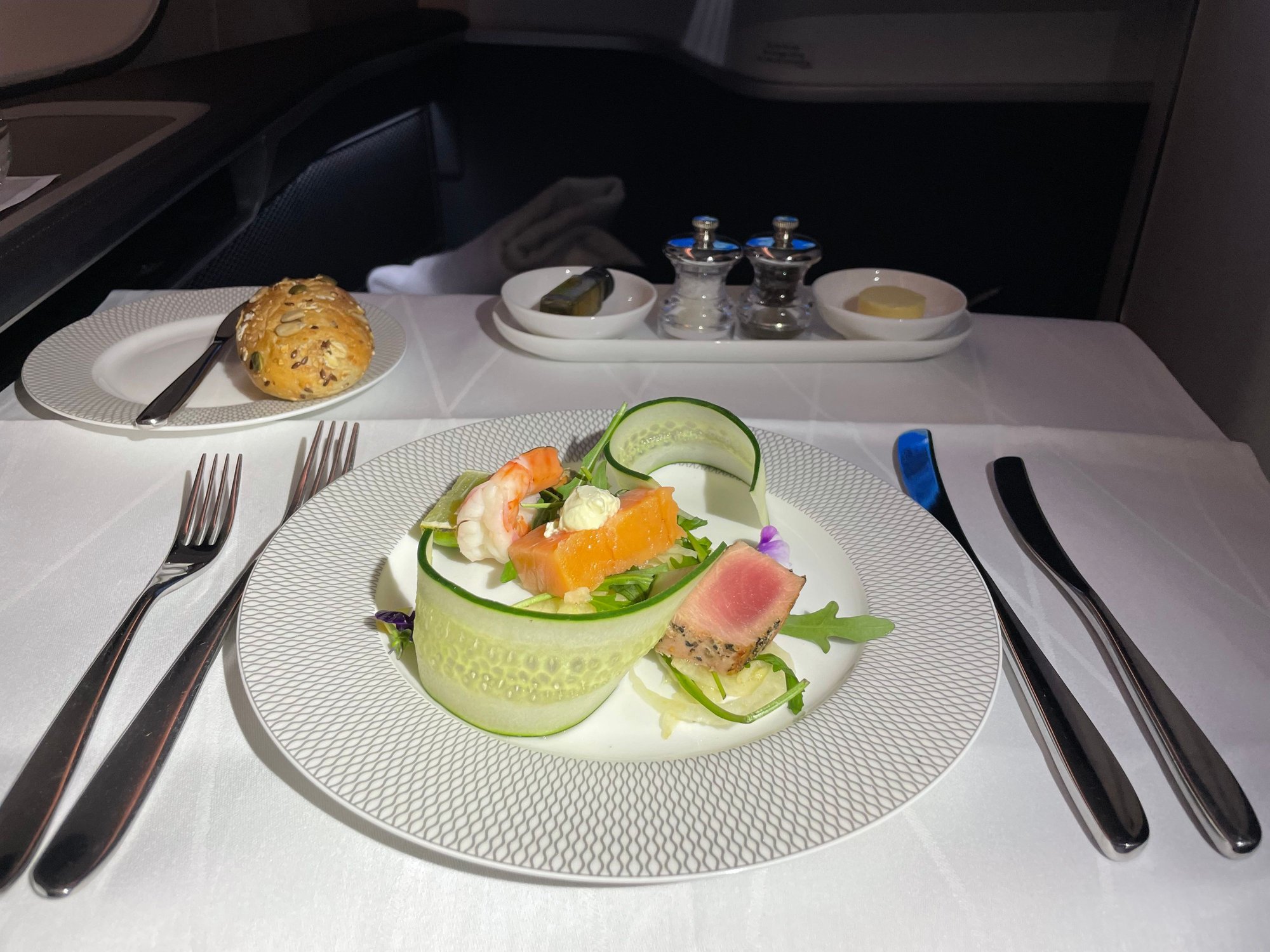salmon, tuna and prawn starter SIN - LHR (quite tasteless)