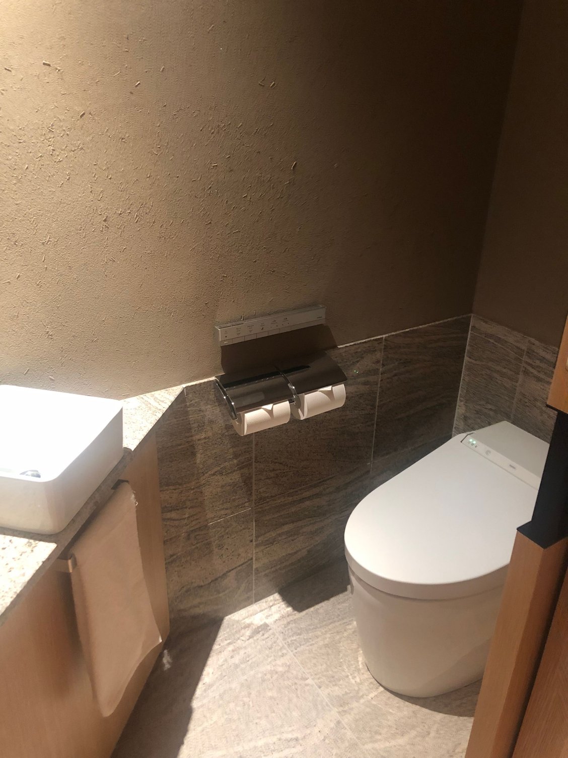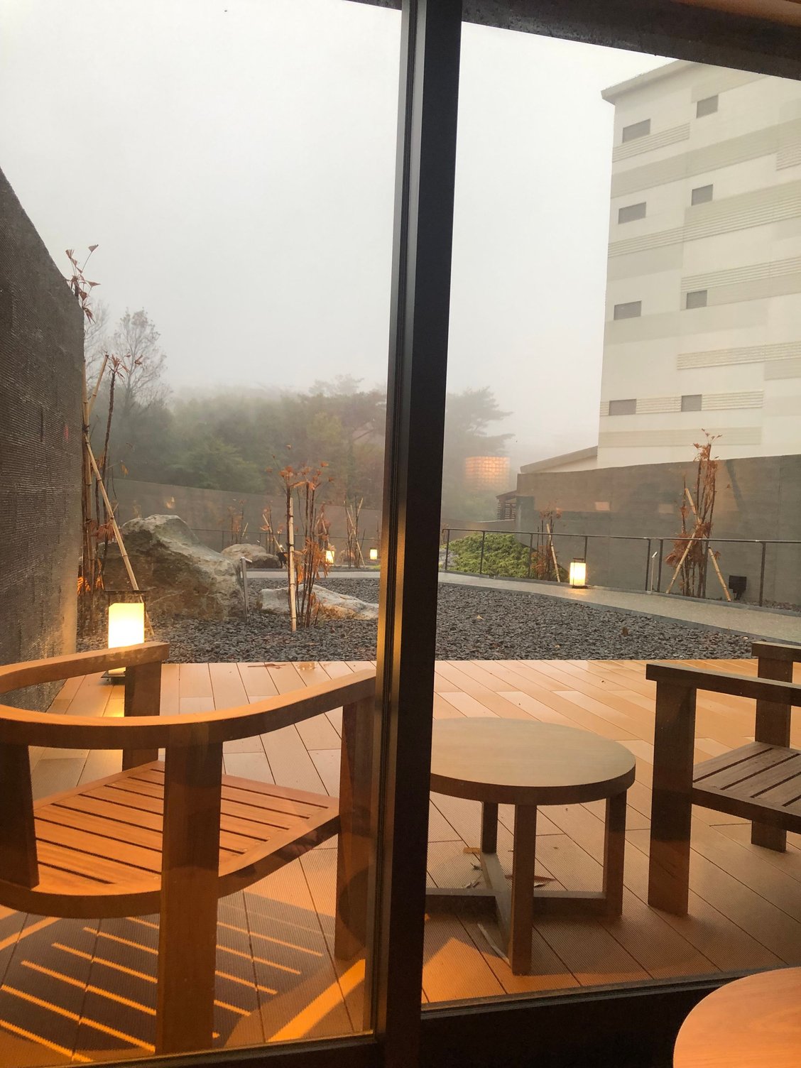 When we arrived, we were met by three staff who took our bags and escorted us with umbrellas to the lobby lounge. We sat in chairs with a view of an artificial pond beyond which geothermal smoke billowed into the sky. The lobby lounge tastefully and attractively combines both Japanese and Western aesthetics and design and is a very relaxing space. A young man came over to check us in and then escorted us to our fourth-floor room where he explained the room’s features, scheduled our breakfast time, and answered our questions.