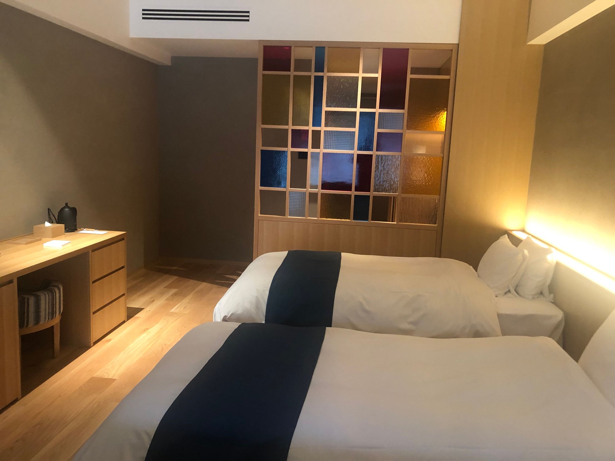 A floor-to-ceiling window covers the entire wall of the living room area, affording us a picturesque view of the pond, the geothermal hell, and the verdant forest. The 463 sqf room is rectangular with a living room area containing an L-shaped sofa and low coffee table with a smallish LCD TV (that can be pulled out at an angle) mounted on the wall. The beds are mattresses placed on an elevated wooden platform and were surprisingly comfortable. Opposite the beds is a wooden cabinet containing a refrigerator, drawers, cups, glasses, and tea and coffee-making utensils. A stained glass paneled motif (a popular motif in Nagasaki that pays homage to the area's Christian history) divides the room from the closet and bathroom areas. The bathroom contains a spacious stone-walled shower, and the toilet is in a separate room. Overall, the room is tastefully designed with a kind of Zen-ish simplicity but was a bit too spartan and simple (in a monastic kind of way) for my taste. However, the living room area is comfortable, and we enjoyed spending time relaxing there and taking in the view.