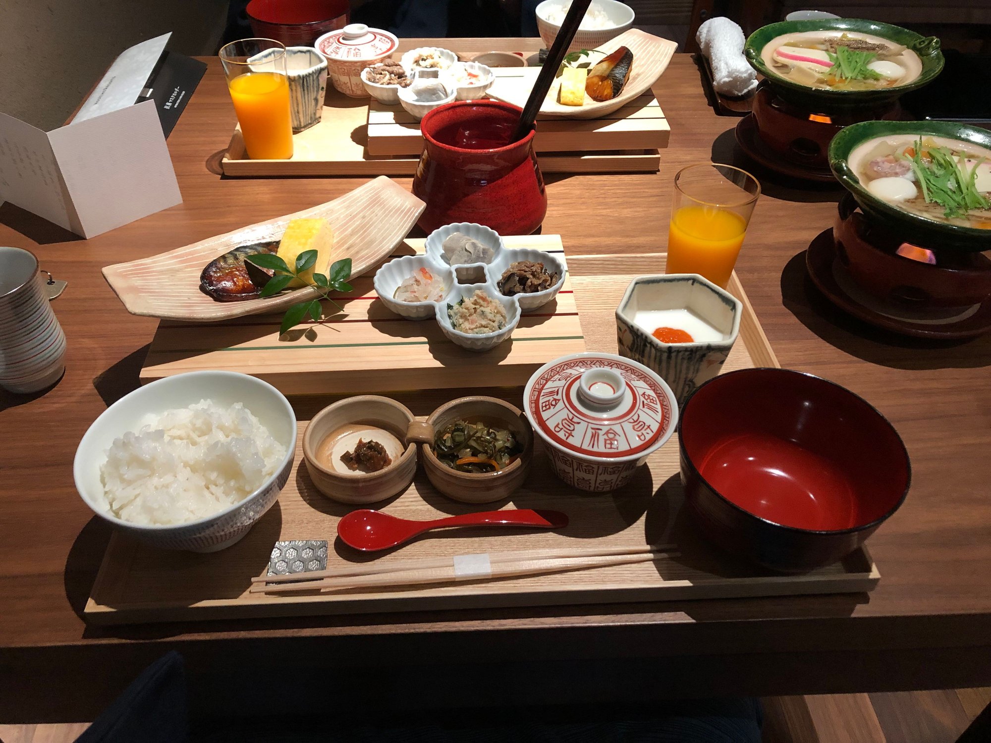 We did not eat dinner in the hotel restaurant, but instead brought some take-out sushi with us so we could eat quietly in our room, as the hotel has no in-room dining or room service. Breakfast was served in the hotel’s first-floor restaurant next to the lobby. The restaurant is spacious and divided into separate dining spaces for each couple or group. Instead of dividing walls, there are artistically designed panels that divide the dining spaces. Although aesthetically interesting, the entire dining space was windowless and overly dark, and this was at breakfast time. This stood in stark contrast to the lobby with its large windows which brought in bright outside natural light. The Japanese breakfast (I don’t think there was a Western option) was very good and better than we previously had at the Kyushu Hotel (reviewed up thread) next door. After breakfast, we headed back to the common onsen for our final baths before checking out.