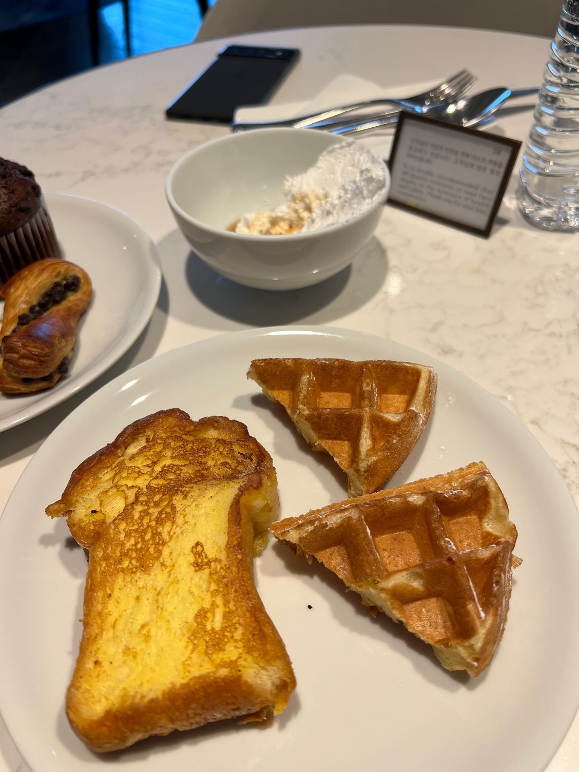 - Breakfast was quite tasty with made to order eggs, tasty pastries in a warming oven, and yummy french toast and waffles
