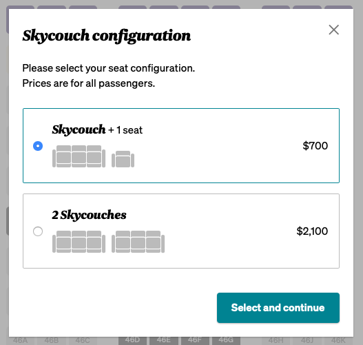 With 3 pax, then you get offered the choice of 2 SkyCouches (~$NZ 2100), or a SkyCouch and a single seat (~$NZ 700)