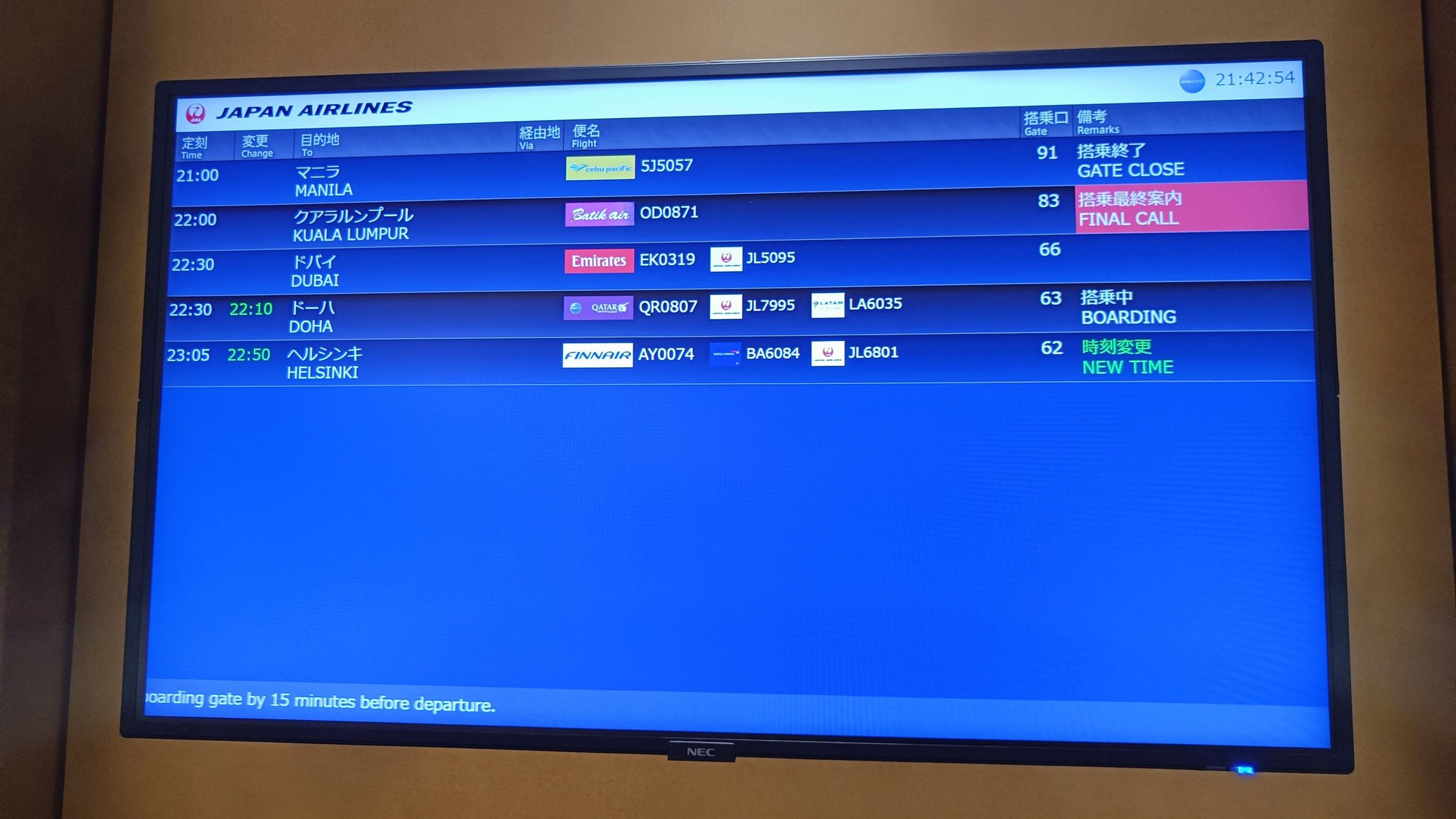 Tonight AY74 is announced to depart 15 minutes before schedule. It is only announced via the airport monitors. No message to customers, check-in desks opened exactly 3 hours before the original departure time, and 'Gate closes' on boarding pass is shown as 22.50 ie the now claimed departure time. Finnair app shows nothing else than original departure.