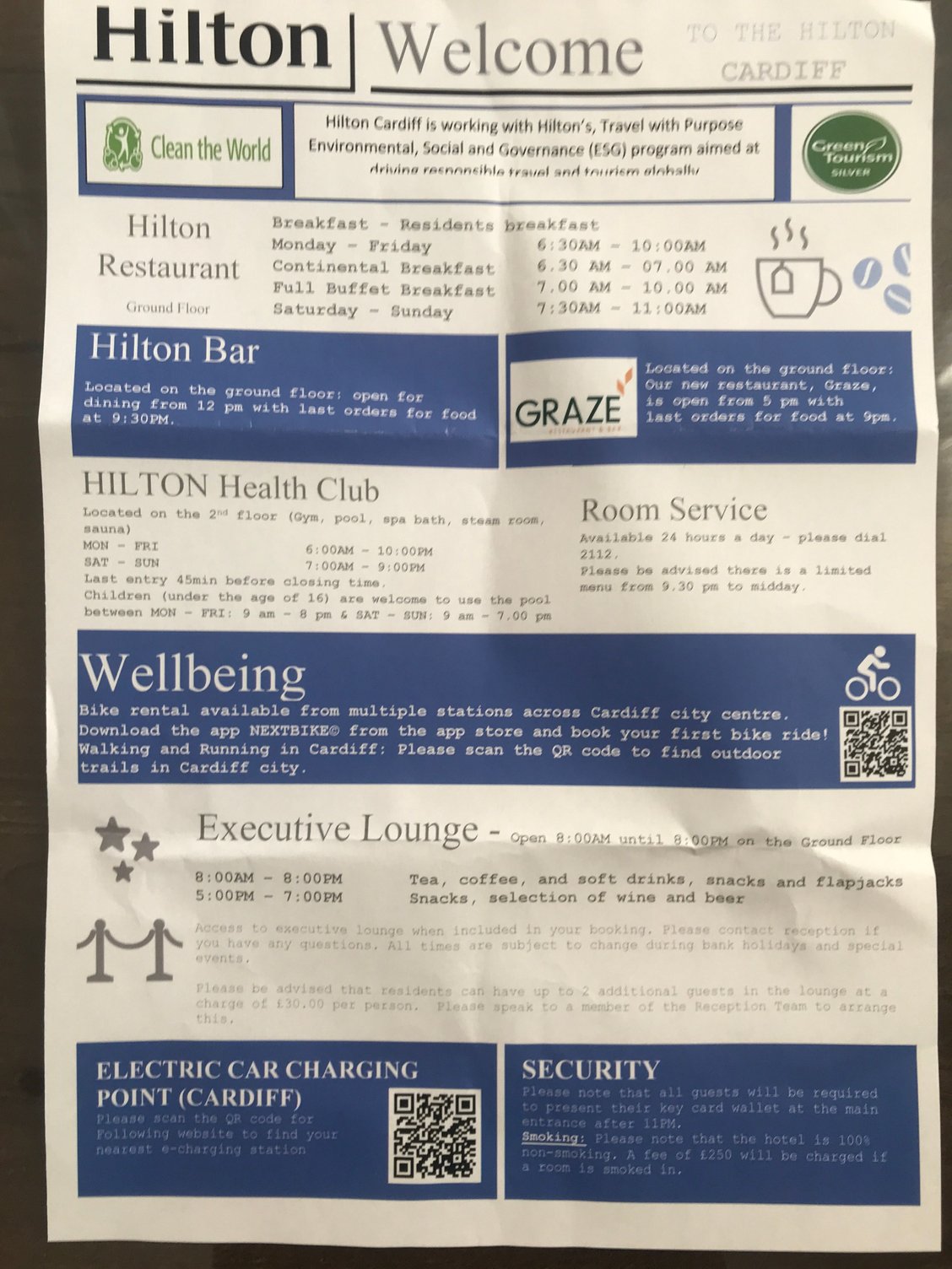 Otherwise nothing really to update from above. Customer service was exceptional throughout - the staff are very nice, solid health club, great pool and spa area, and really top breakfast especially the pastries and fruit/yoghurt sections. There was a nice card from the GM in the room with welsh cakes and extra cans of water as a welcome amenity. Great service.