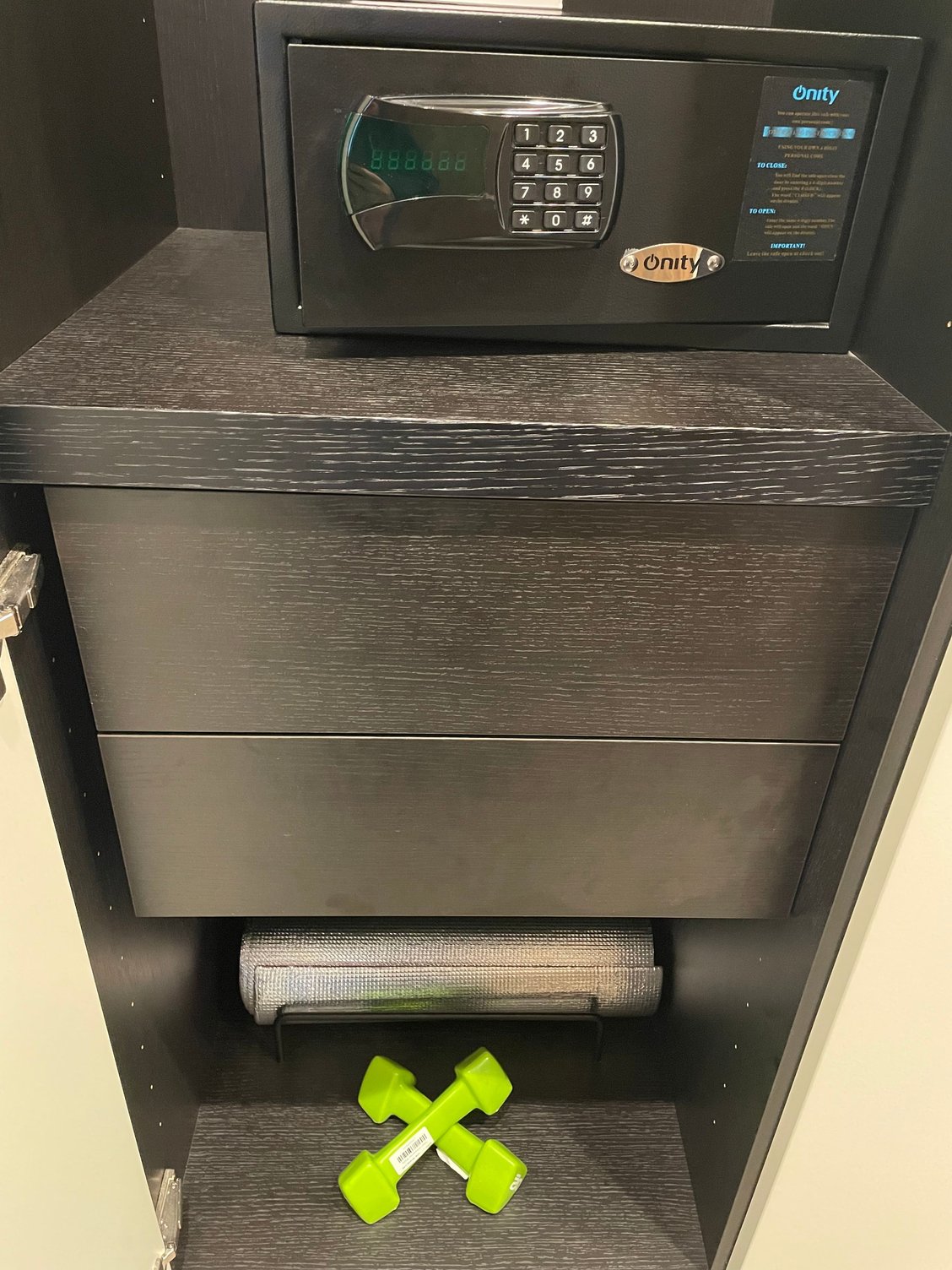 Large separate dressing with yoga mat and exercise weights.