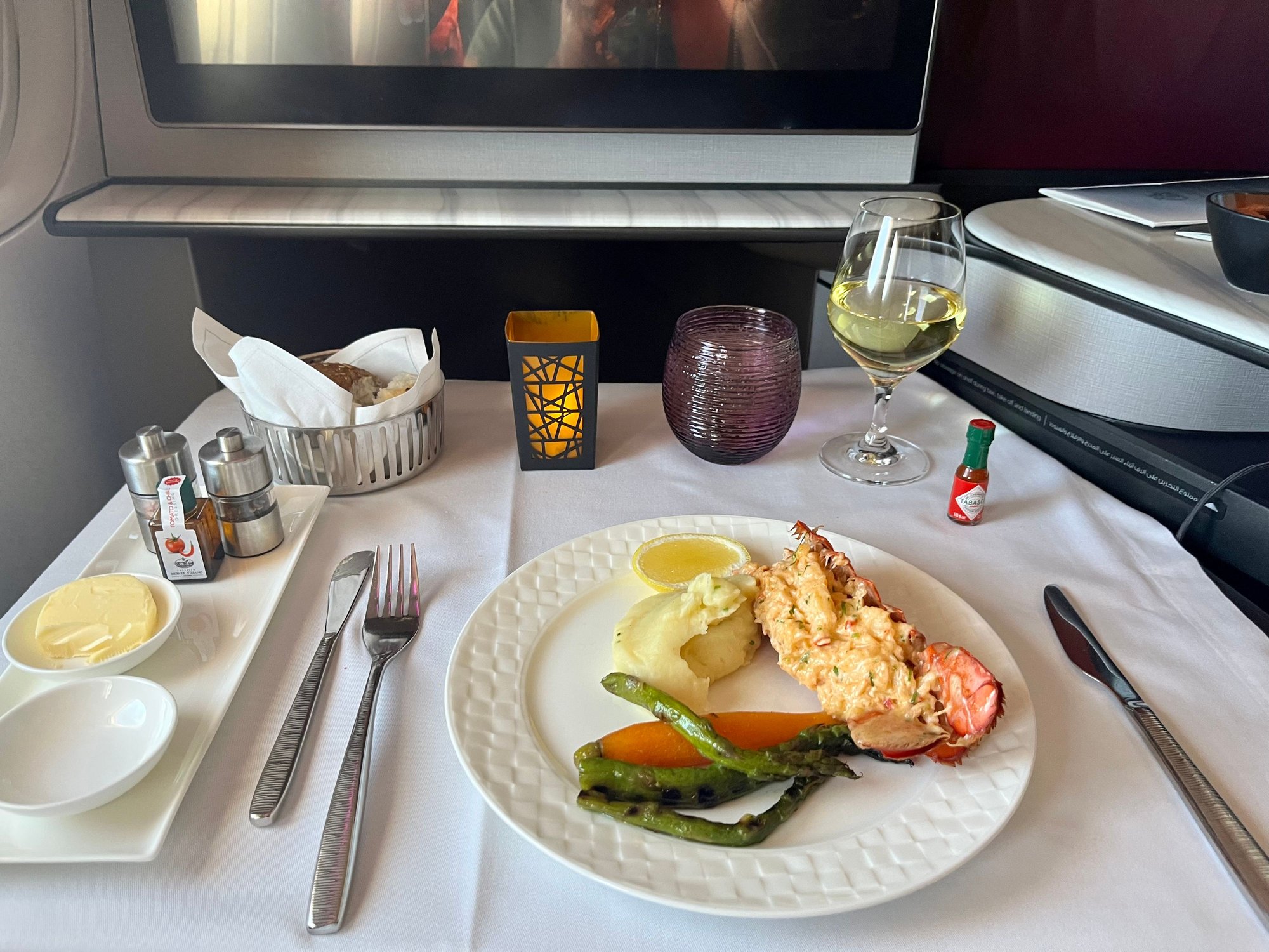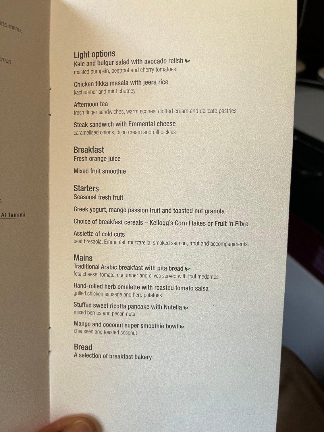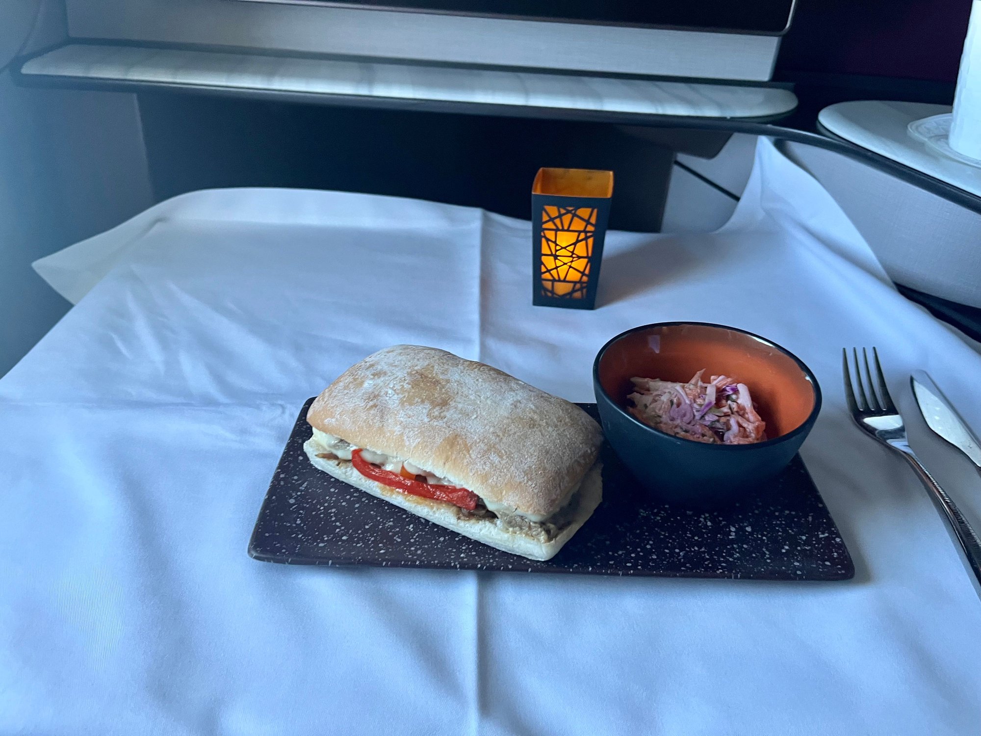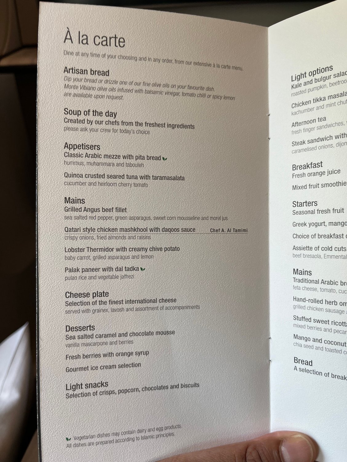 Apologies for not getting the wine menu, but from recollection it was the same as my previous post. Decent ex-DOH meal. Soup was unremarkable, lobster thermidor was very good as was the dessert and the chicken makshool. The steak sandwich was disgusting and inedible, worse than the pandemic era sandwiches you’d find on AA. But the biggest thing to me is further catering issues on QR. I wanted an appetizer for both my main and my second meal, but FA asked (rather than insisted), if I could just have either the soup or an appetizer for the main meal (after serving me the soup, but tbh I wasn’t the hungriest so I obliged) , and then for the 2nd meal, asked if I could have the appetizer from the breakfast menu, which I declined. This whole pick a single item change is def detracting from QR’s promised “a la carte” menu. Honestly, they should just advertise meals as “dine anytime” with a few options to choose from, rather than the current set up since they obviously can’t execute what they promise (and what was the former QR J meal experience)