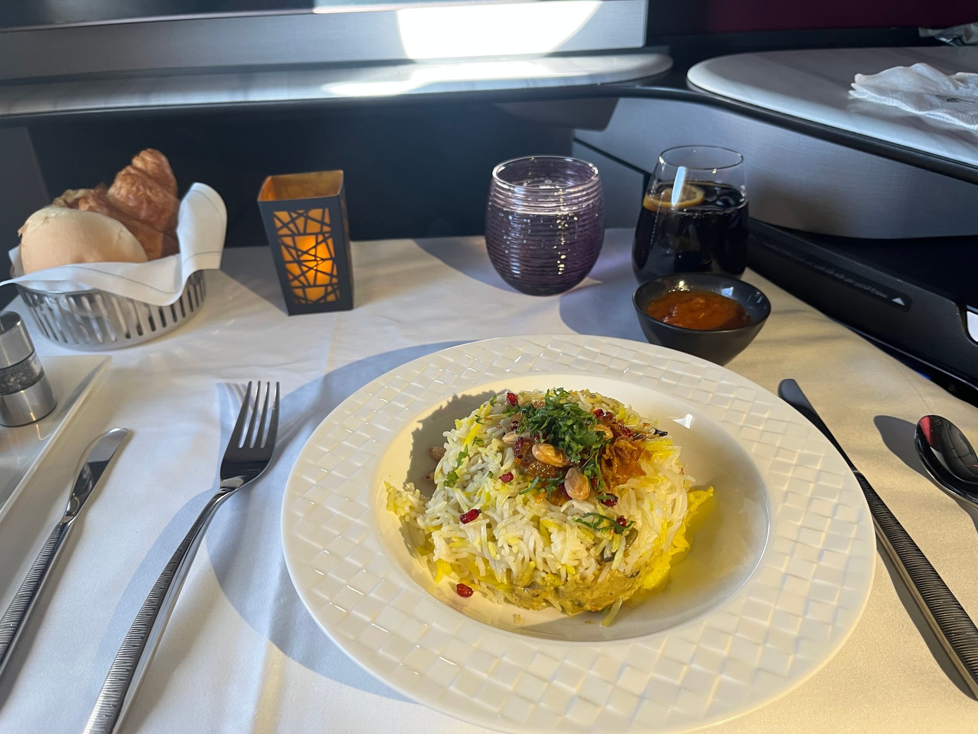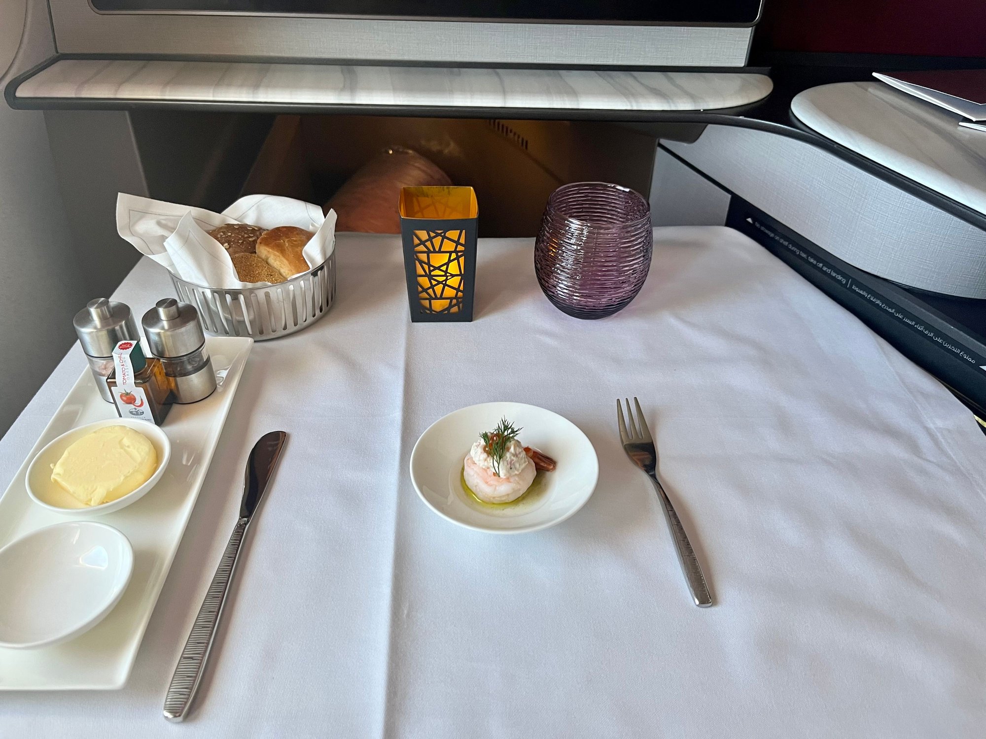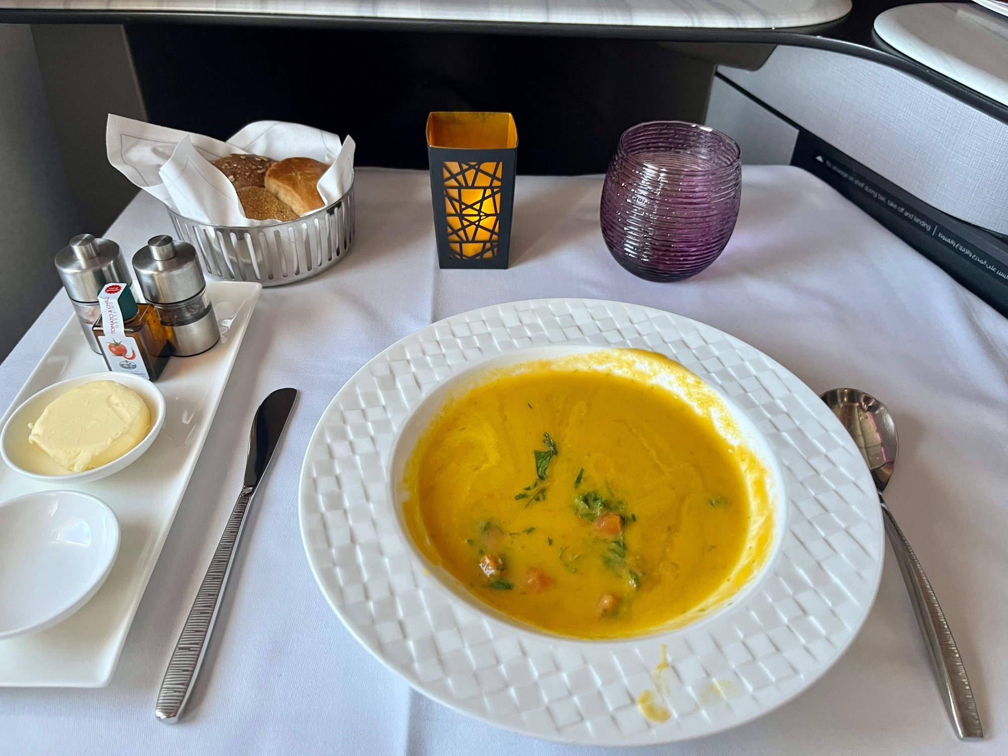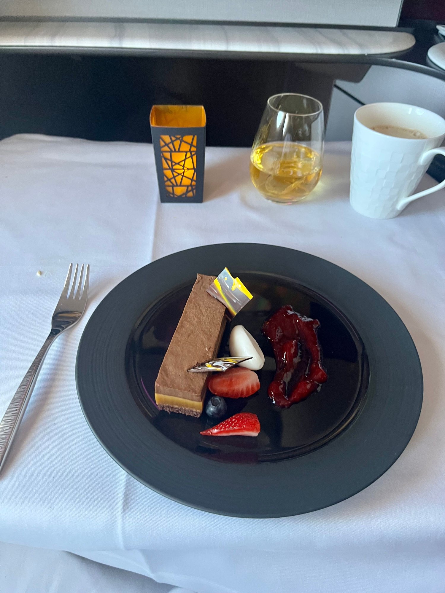 Apologies for not getting the wine menu, but from recollection it was the same as my previous post. Decent ex-DOH meal. Soup was unremarkable, lobster thermidor was very good as was the dessert and the chicken makshool. The steak sandwich was disgusting and inedible, worse than the pandemic era sandwiches you’d find on AA. But the biggest thing to me is further catering issues on QR. I wanted an appetizer for both my main and my second meal, but FA asked (rather than insisted), if I could just have either the soup or an appetizer for the main meal (after serving me the soup, but tbh I wasn’t the hungriest so I obliged) , and then for the 2nd meal, asked if I could have the appetizer from the breakfast menu, which I declined. This whole pick a single item change is def detracting from QR’s promised “a la carte” menu. Honestly, they should just advertise meals as “dine anytime” with a few options to choose from, rather than the current set up since they obviously can’t execute what they promise (and what was the former QR J meal experience)