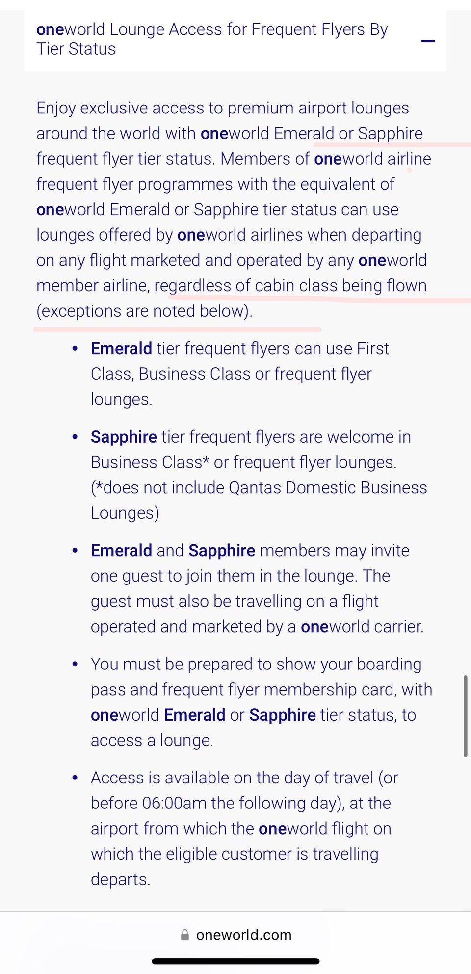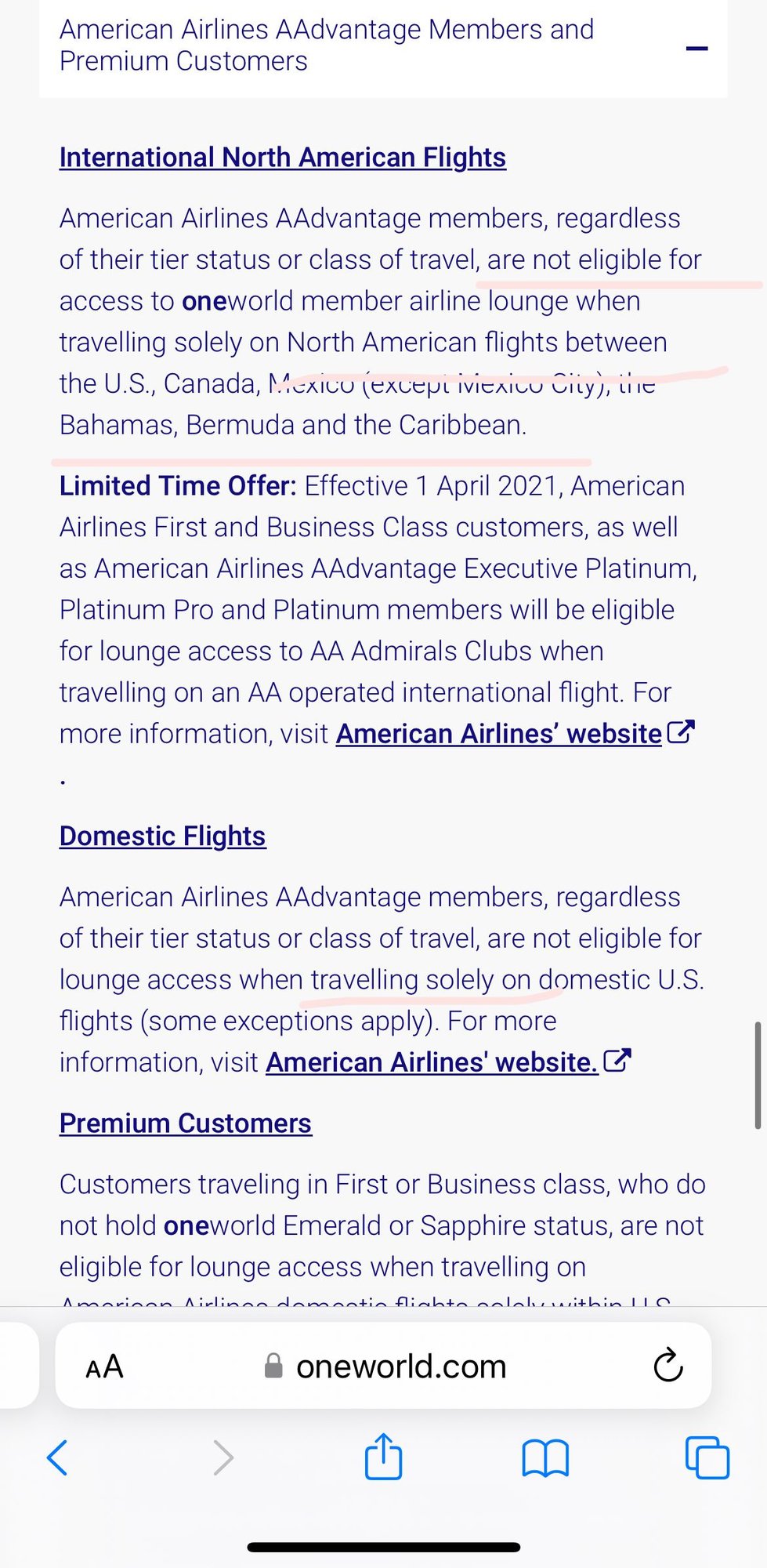 The AA exception is pretty clear they’re saying domestic flights don’t qualify even if you have emerald. Meaning you can’t use Admirals lounge and the equivalent say SFO-SEA. “Solely” domestic can only mean this. My itinerary was international, inclusive of domestic connection all under one confirmation code. I don’t know how else “solely” domestic can be interpreted. How can my flight be mixed domestic and international to be a non “solely” domestic?