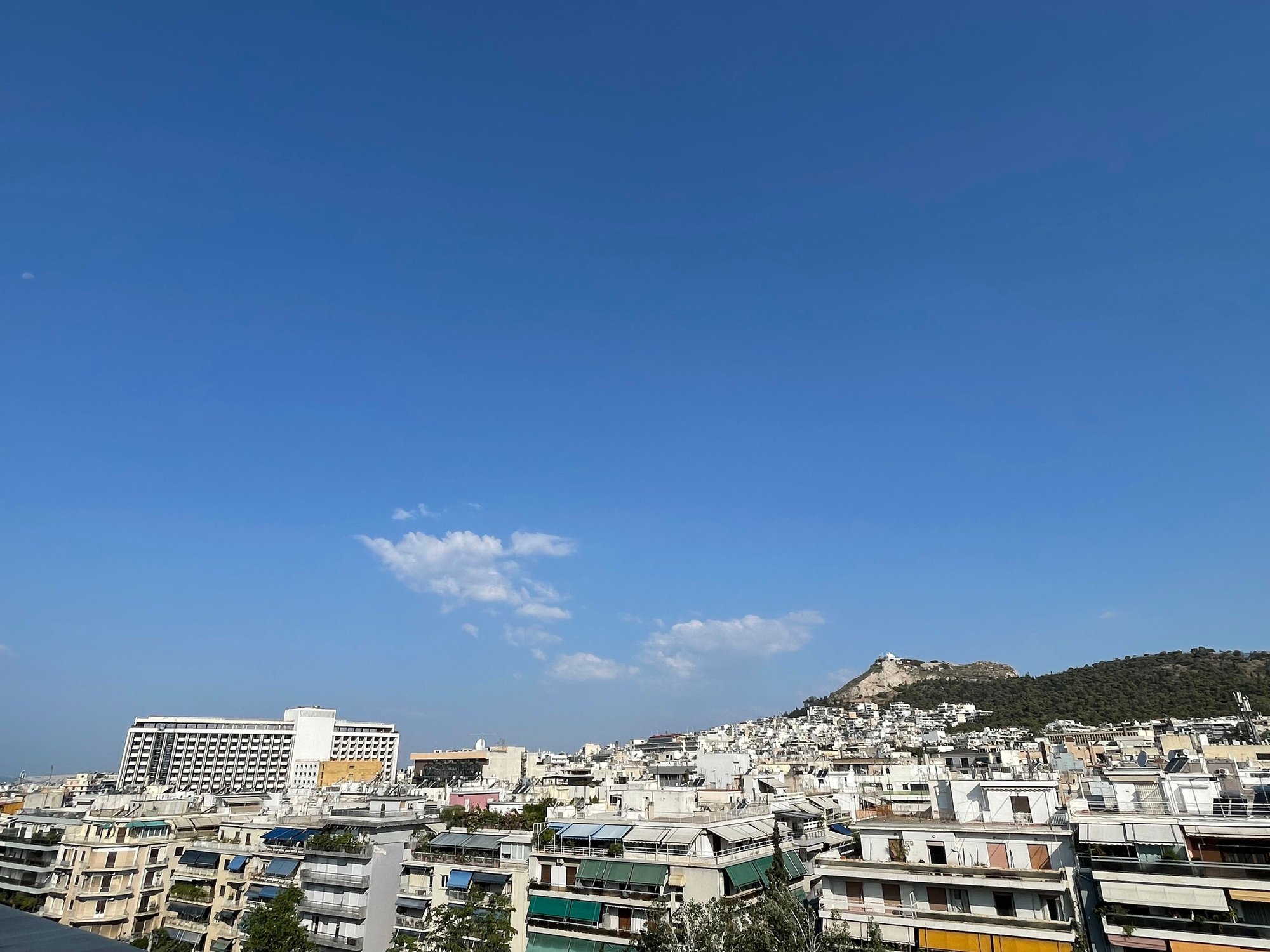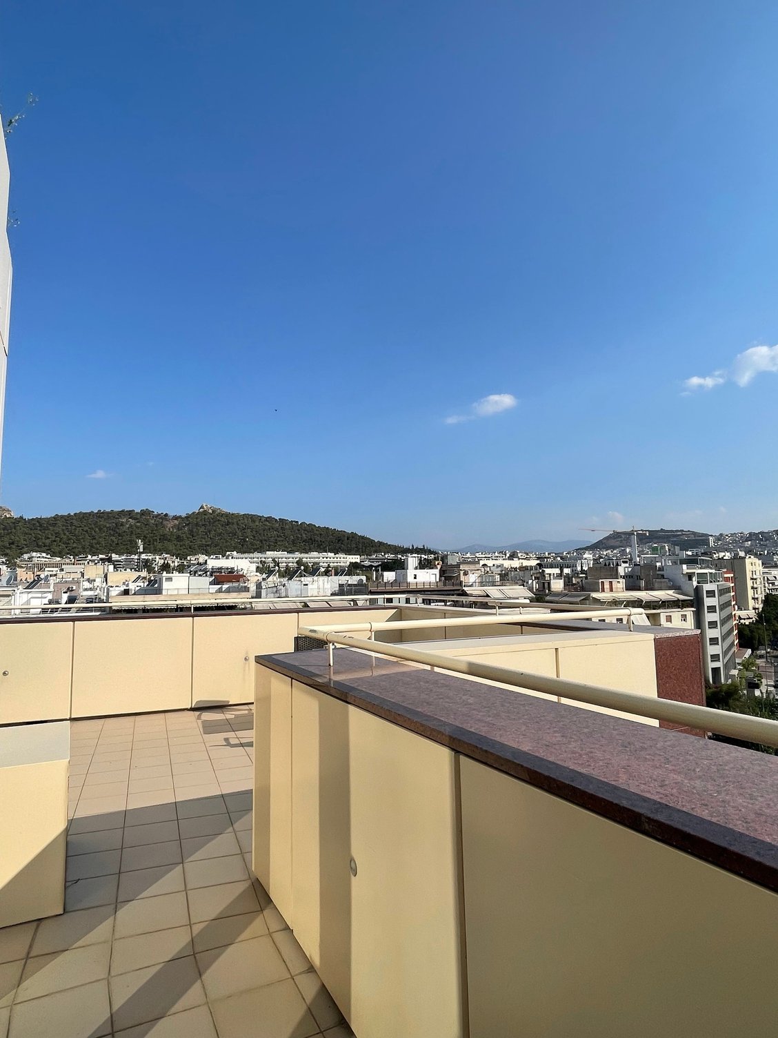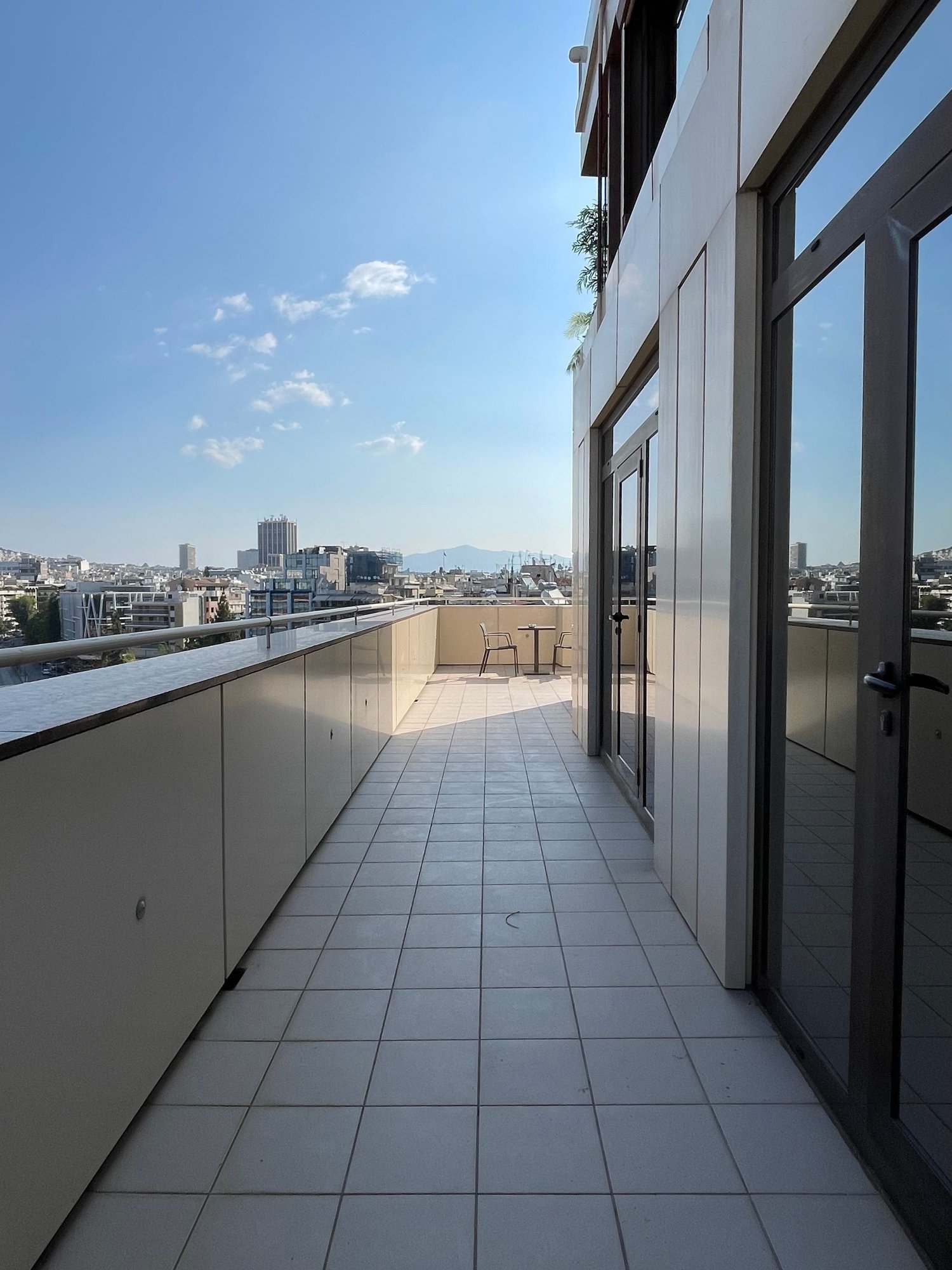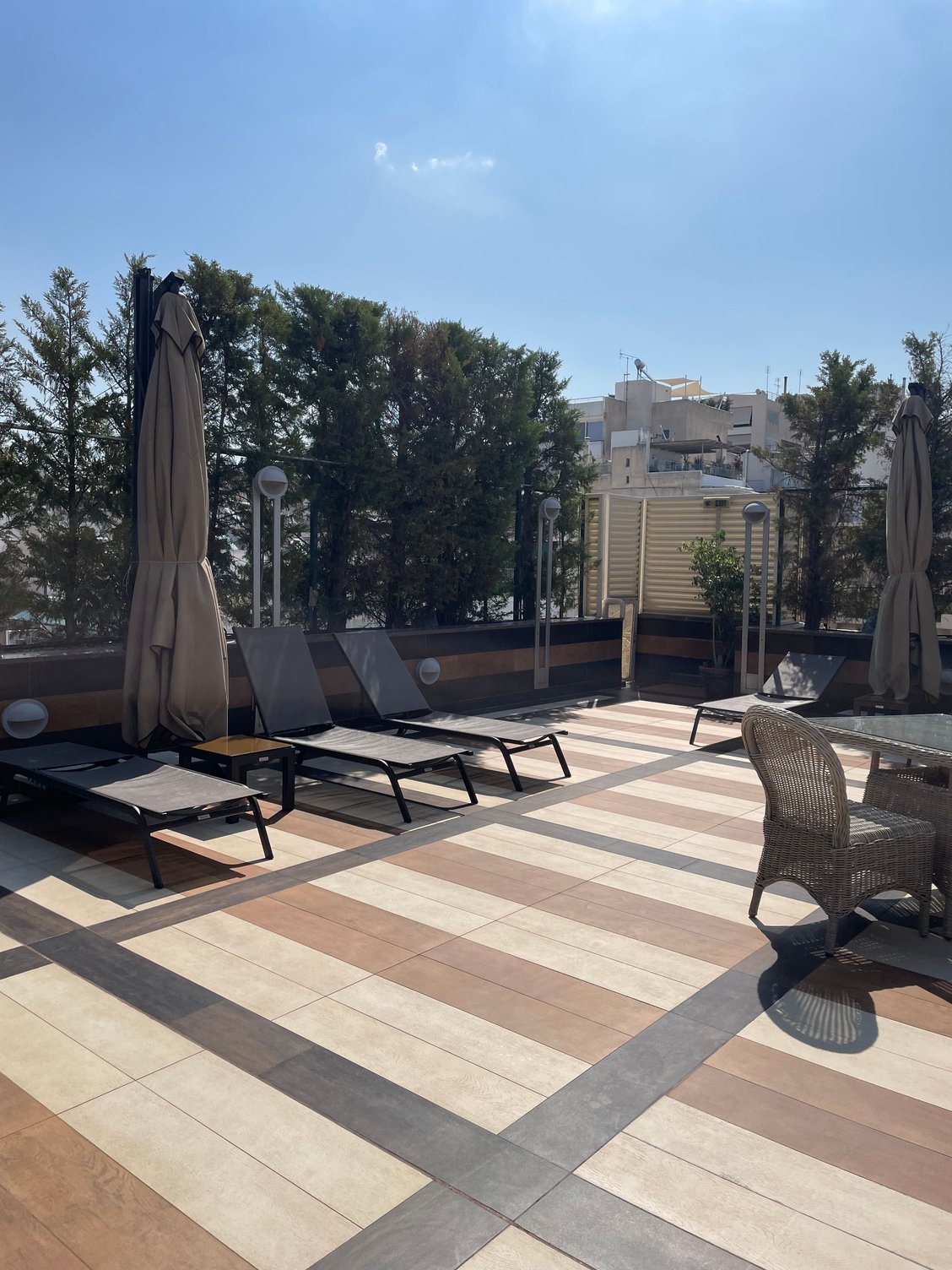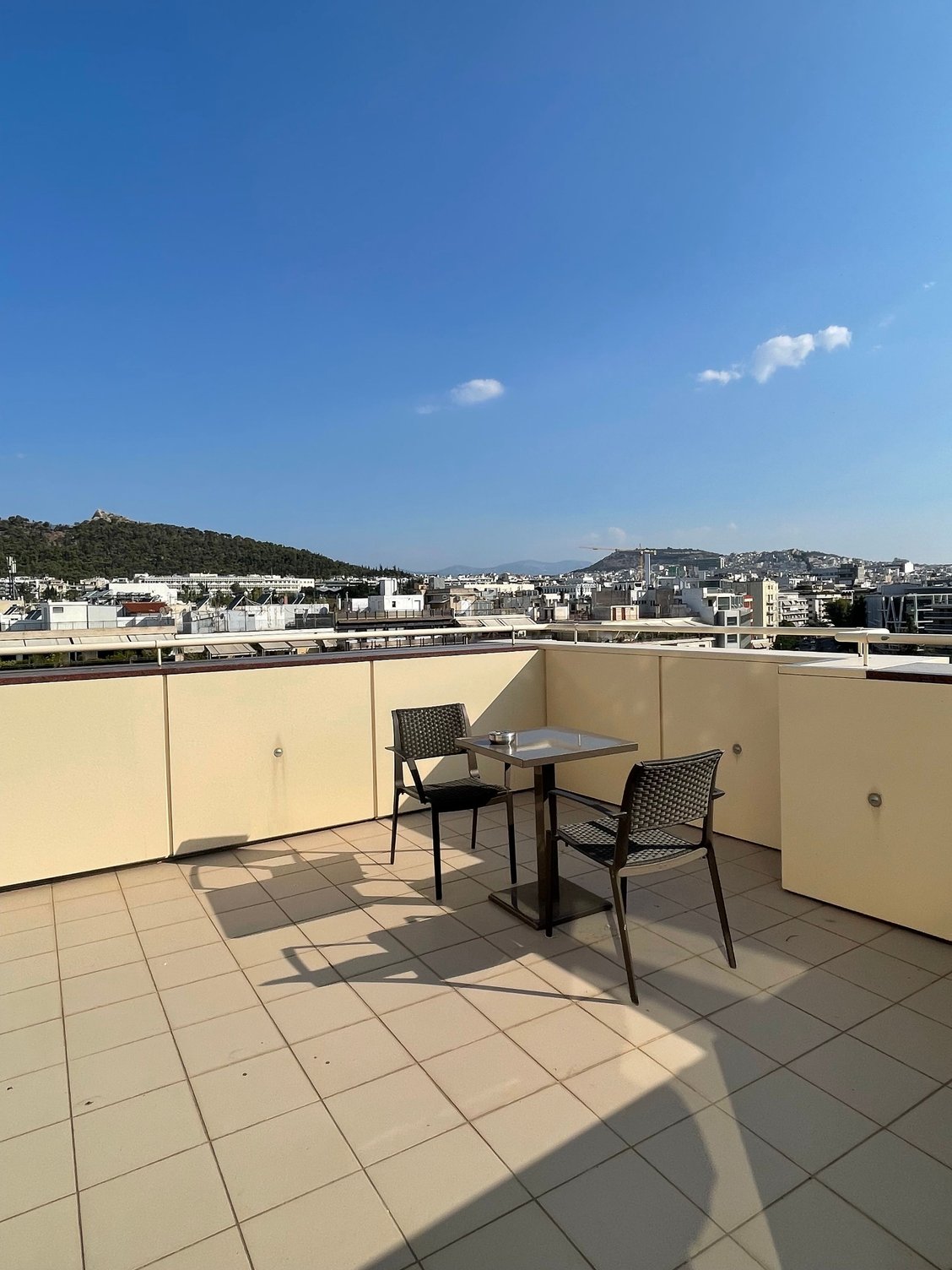 Large terrace along the corner suite with table and chair, view over Lycabettus
