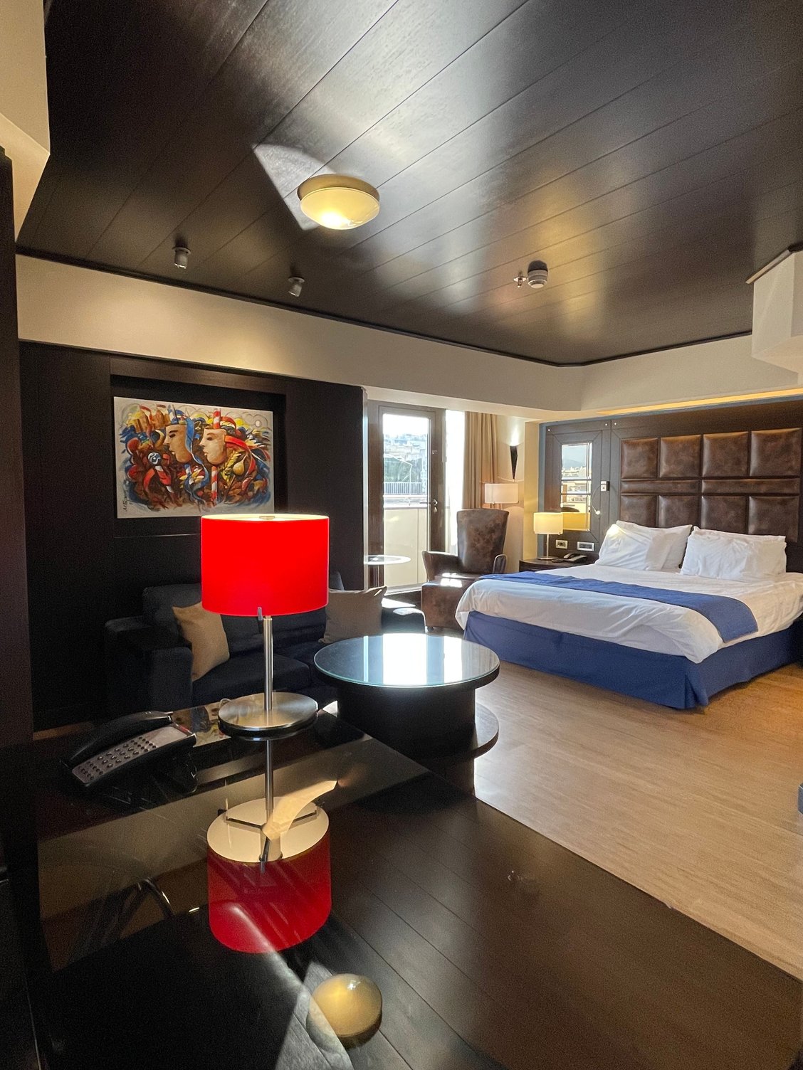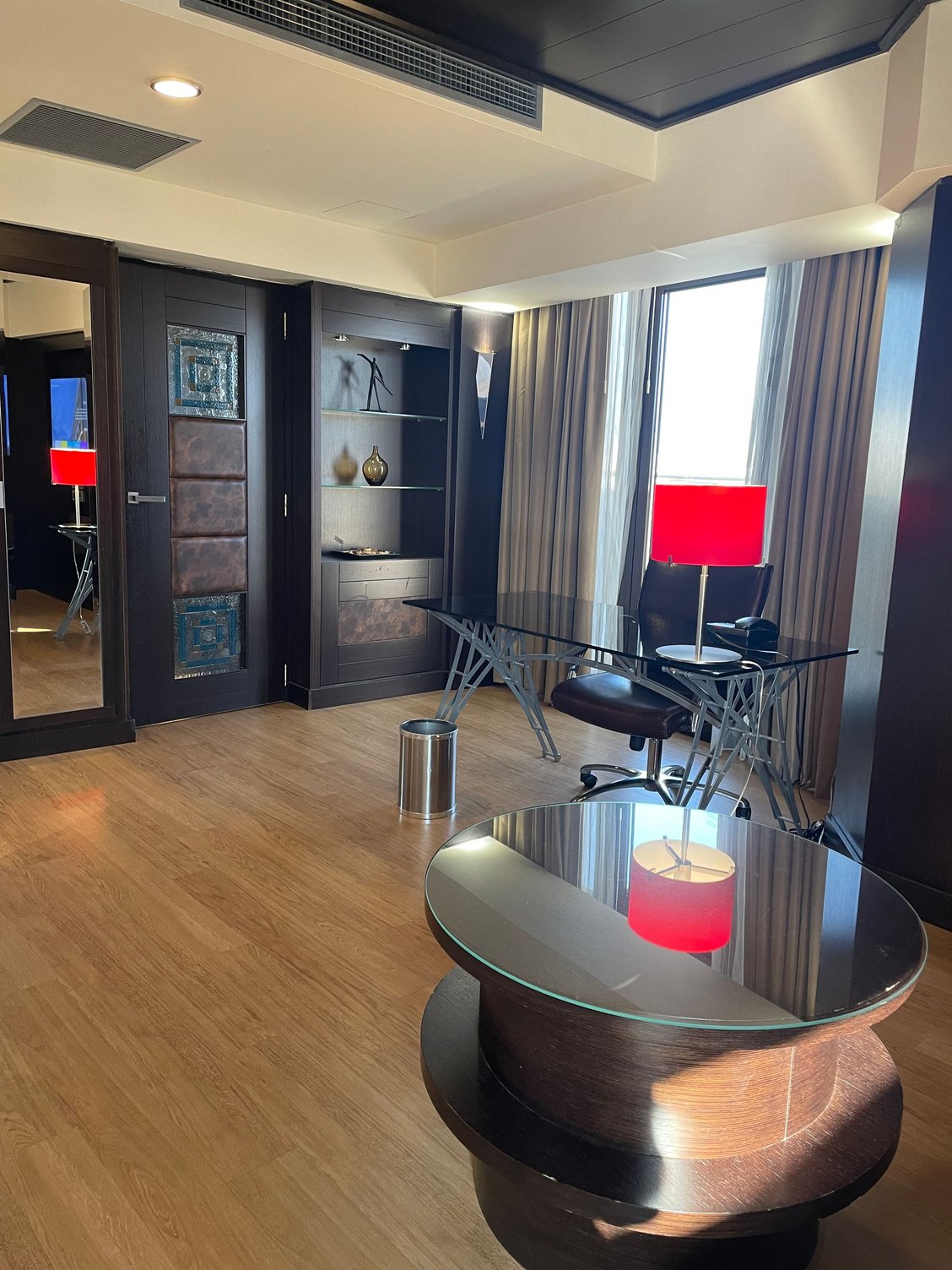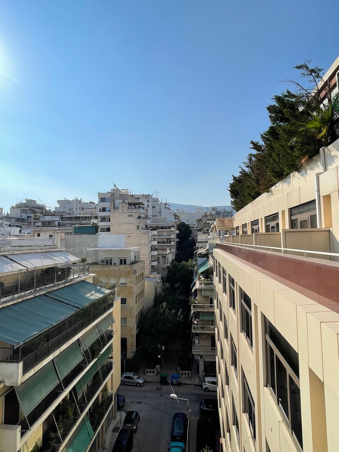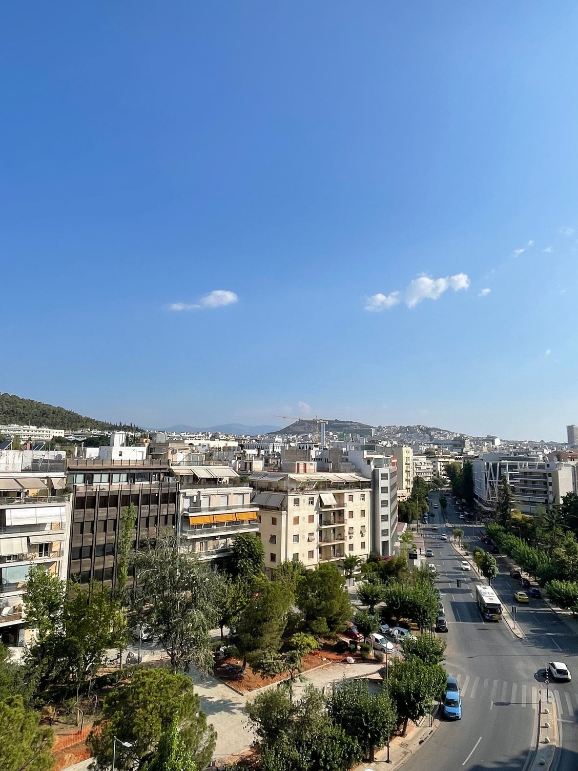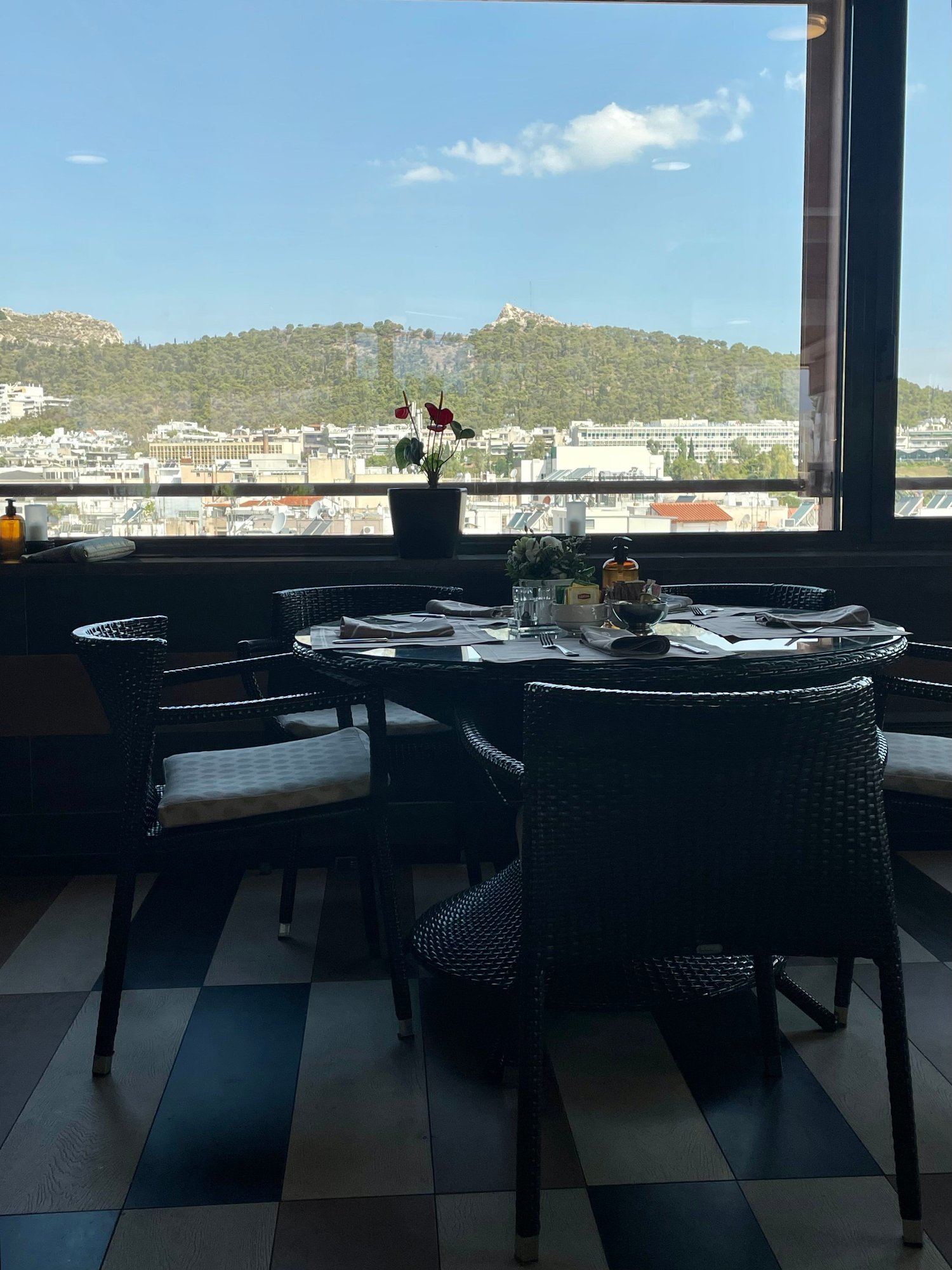 Large terrace along the corner suite with table and chair, view over Lycabettus