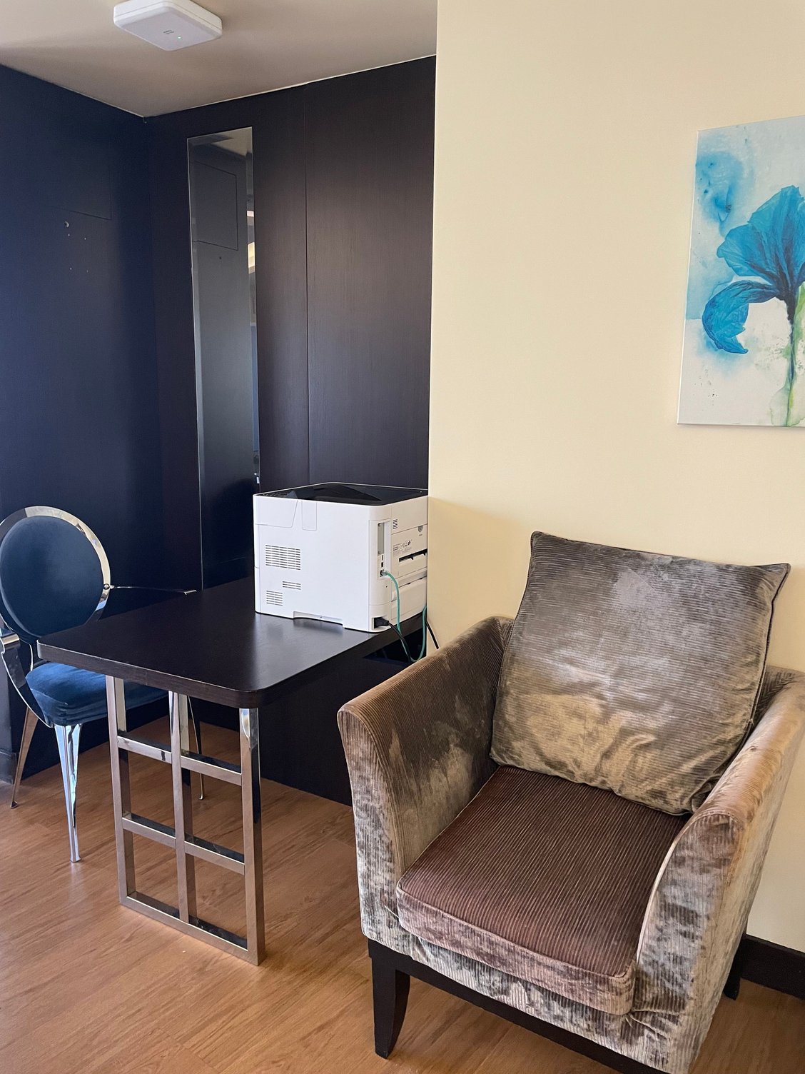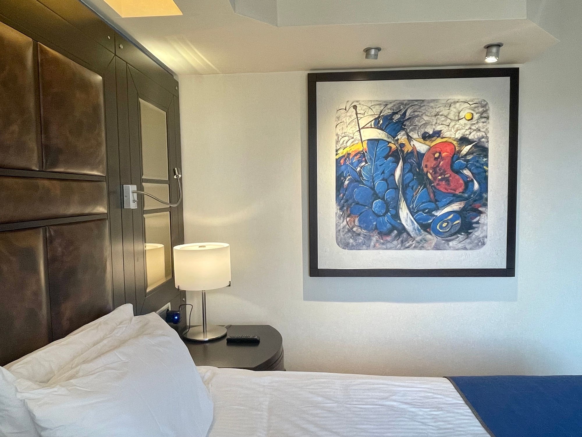 Bedroom with very comfortable bed with us sockets next to the bed.