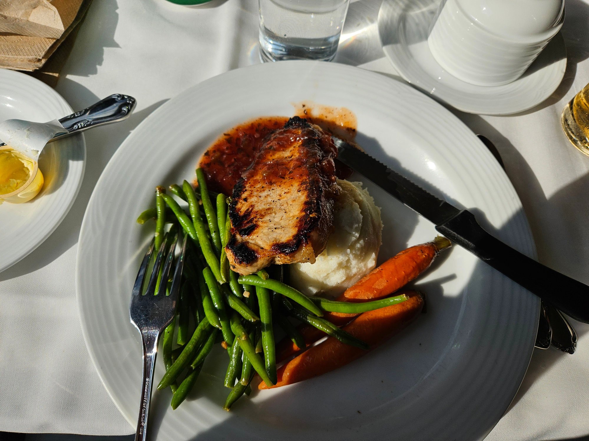 Dinner is very rushed as the crew needs to get out before Winnipeg. Suggest you take the earlier seating. Since the crew was rushed there was only a salad option (no soup) and 1 side (mashed potato) and 1 dessert option. They also ran out of the dressing for the salad and linens for the tables (paper napkins only). They also didn't want passengers to linger after dinner so the next seating can be done quickly.