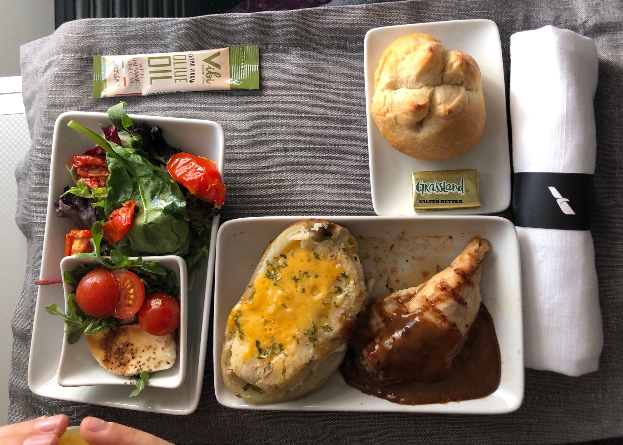 PHX-ORD chicken espagnole - I don't understand the salad/appetizer (it looked like other plates had prosciutto on their salads). Chicken was fine, potato was good.
