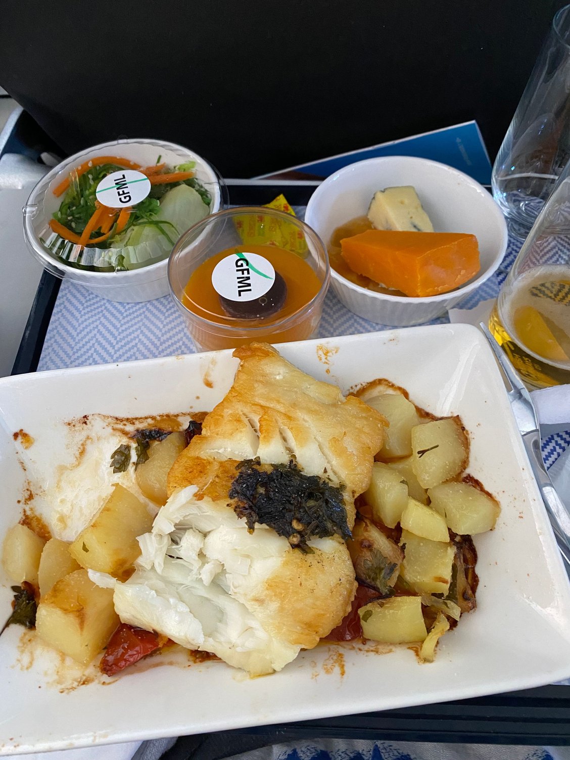 Here is the gluten free meal in Club Europe SAW-LHR 7/21. Fish and potatoes. It was okay. I’m not sure what the dessert was (some sort of apricot custard), but it was excellent. Great FAs on that flight.