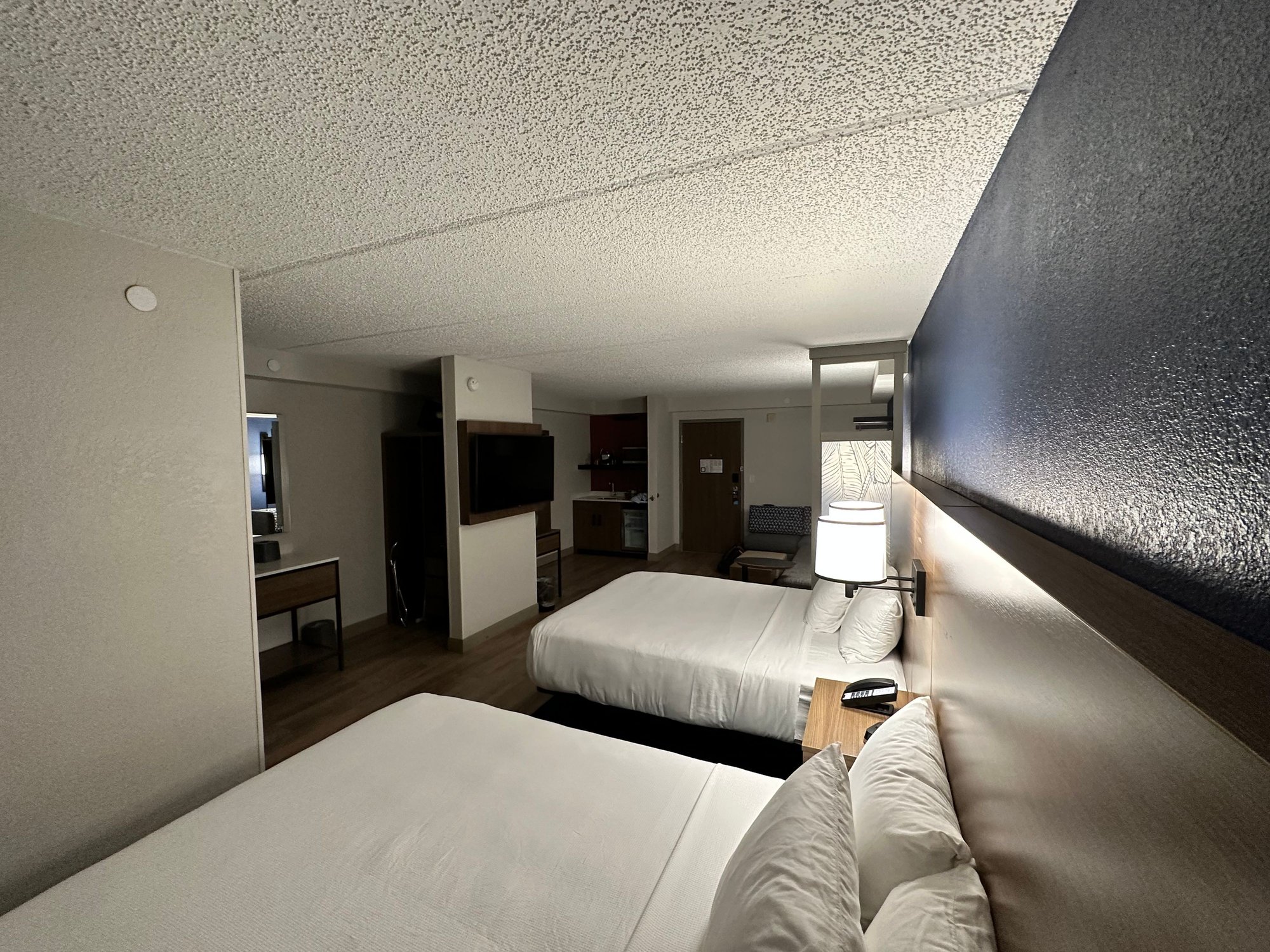 hotel: it’s really close to Hyatt house (about a 2 minute walk) and about a 30 minute drive to MCO. The overall state of the hotel is well kept. The lobby area is spacious and open providing plenty of seats for breakfast. I didn’t check out the pool here. The elevators are old and would make a banging sound whenever going up past the 2nd floor. It would sometime skip my floor when requesting which was annoying. There’s a universal rep located in the lobby which provides shuttle services (10:55am being the last one in the morning and 8pm being the last one at night). The rep would also leave at 11am.