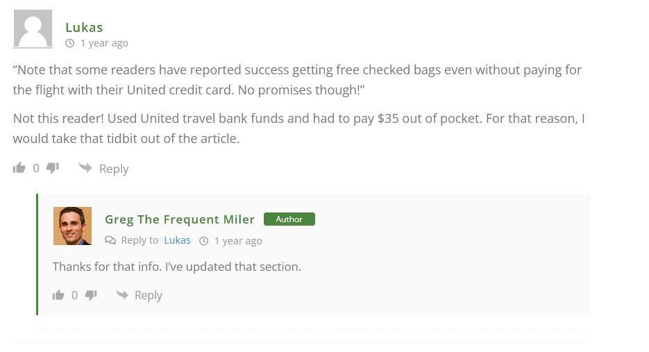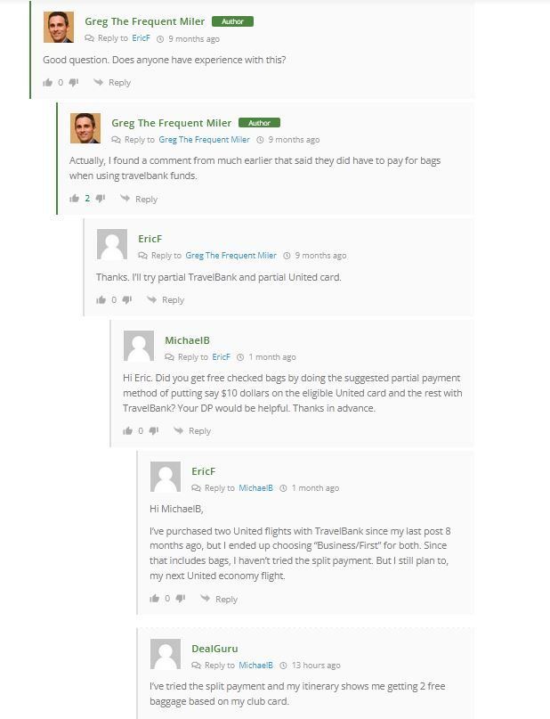 There's an interesting question in the Frequent Miler blog comments today on Free checked bags for United Chase card holders paying with Travel Bank entirely (vs putting a small amount on the card and the balance with Travel Bank) and still getting free checked bags. Wondering if any insight here/DPs?
