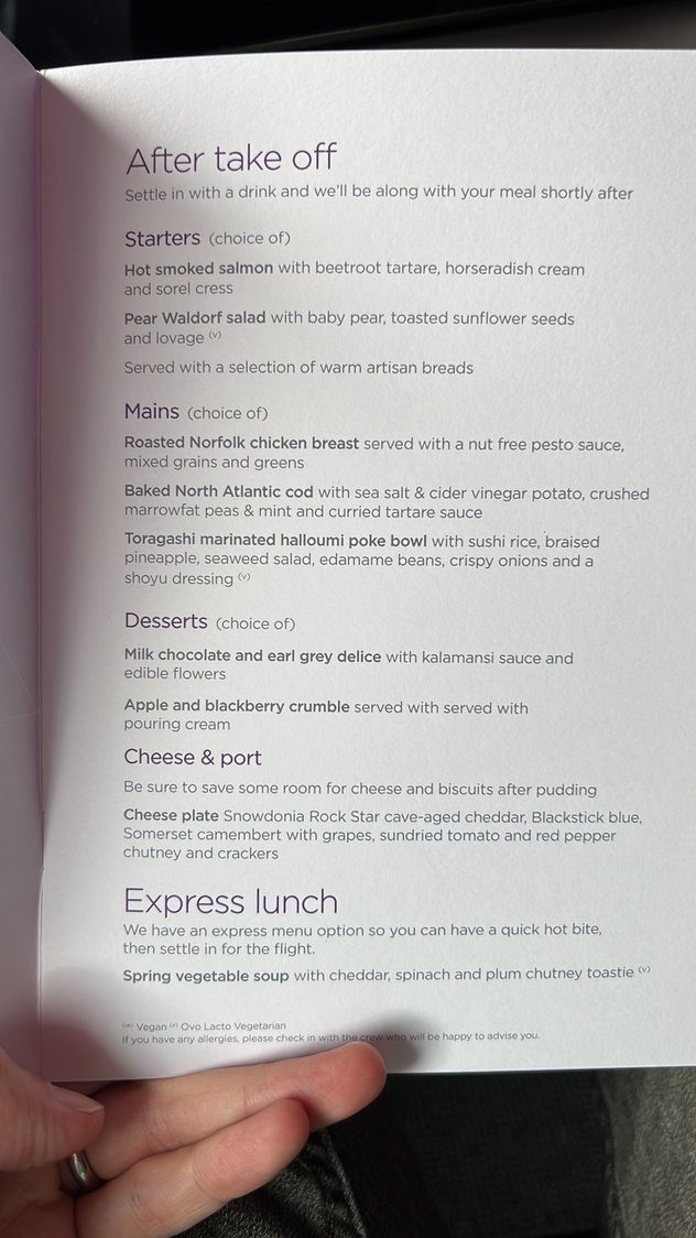 Currently flying to Tampa. I had the Waldorf Salad which was excellent, the lamb (pre ordered) which was so-so and the chocolate dessert thing which was very odd and not great.