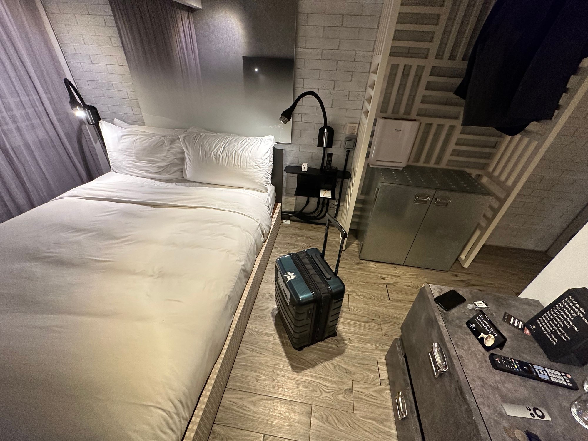 - My mini queen room is not objectively small at 20 sqm / 215 sqft but it is poorly designed. The queen bed takes up more than half the room, meaning there is no space to sit at all. There are no stools or chairs or a table to work from.