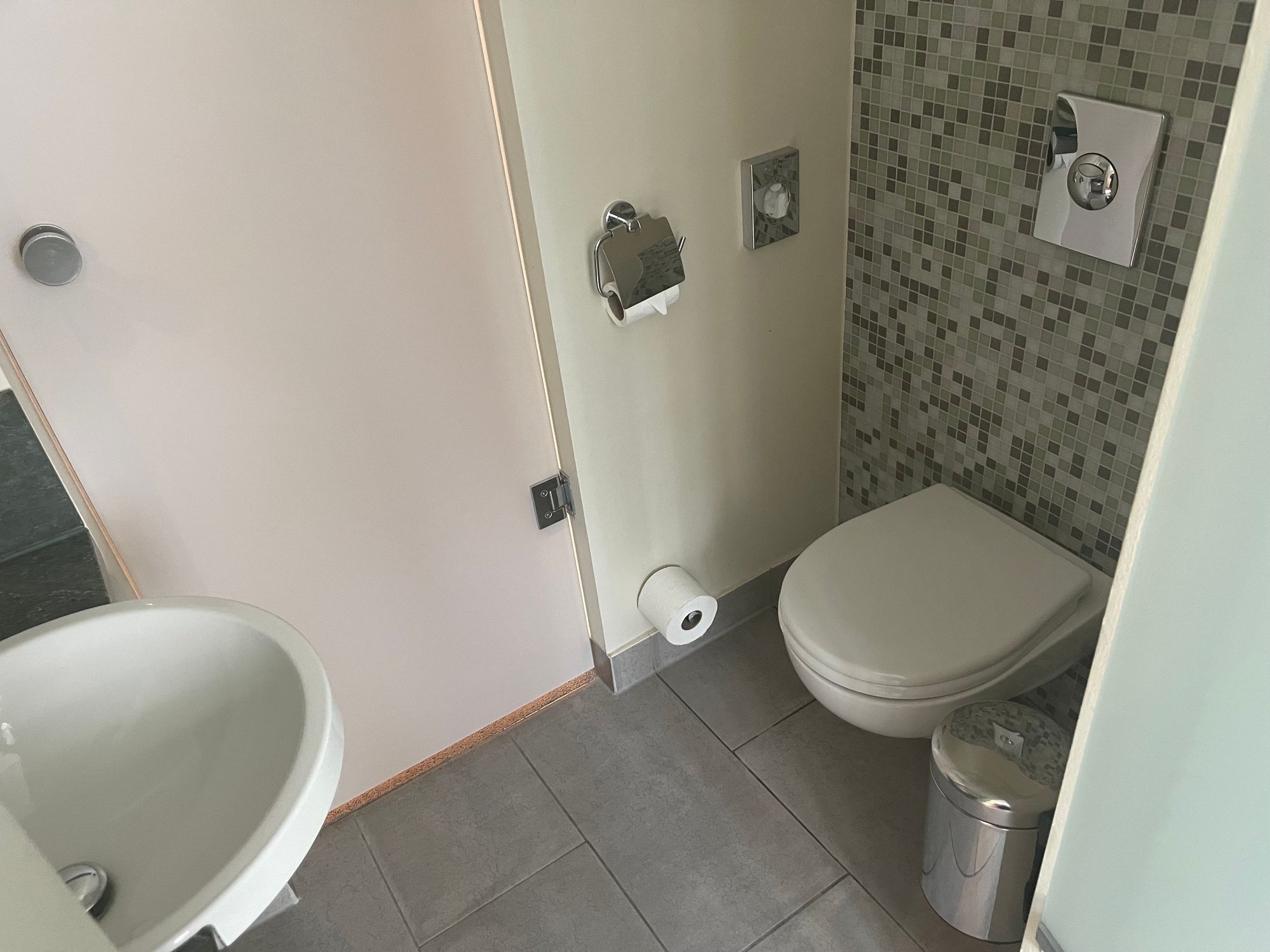The suite is quite nice - separate seating area with glass doors to bedroom. Full sized bath and lots of storage space. Weird loo with two doors, and tiny.