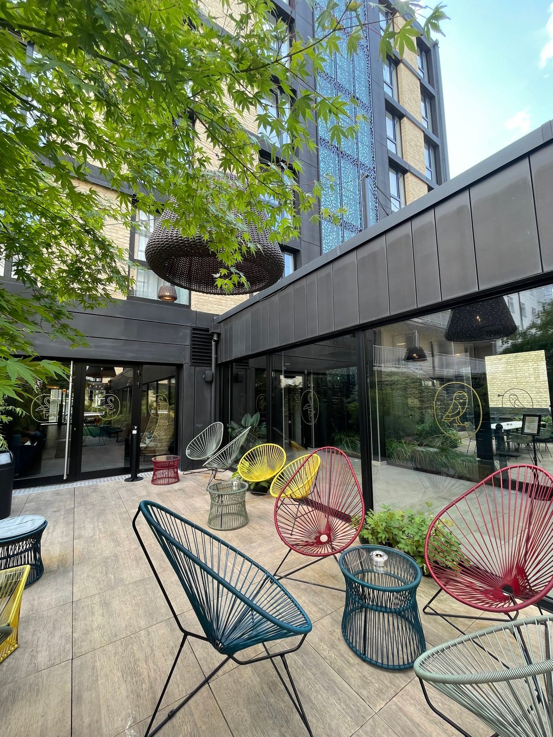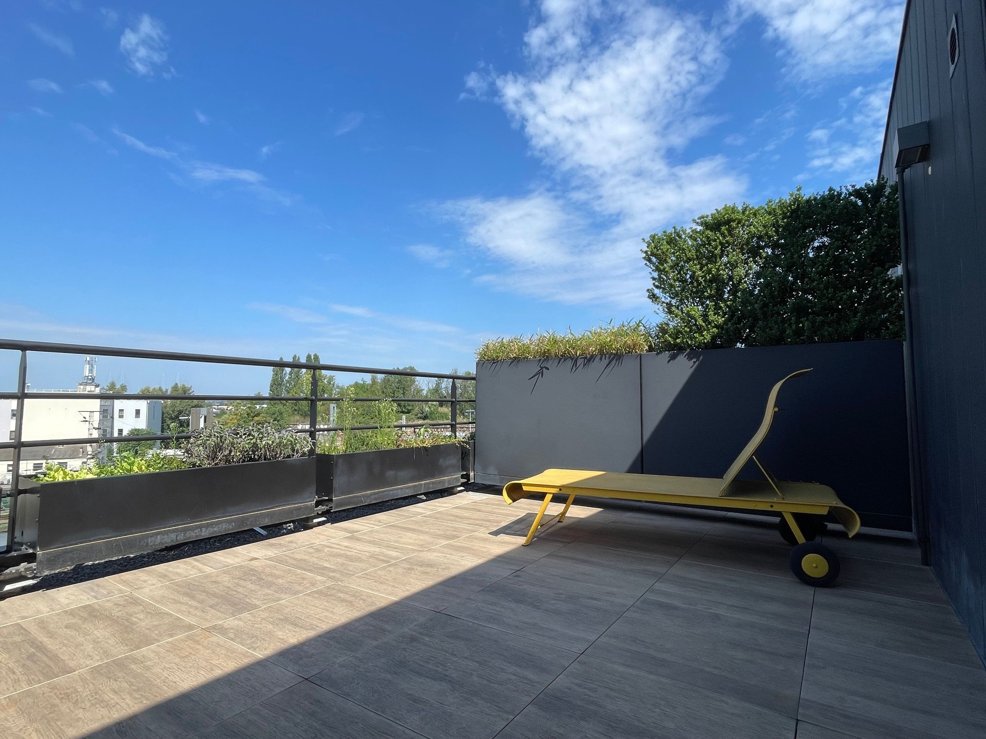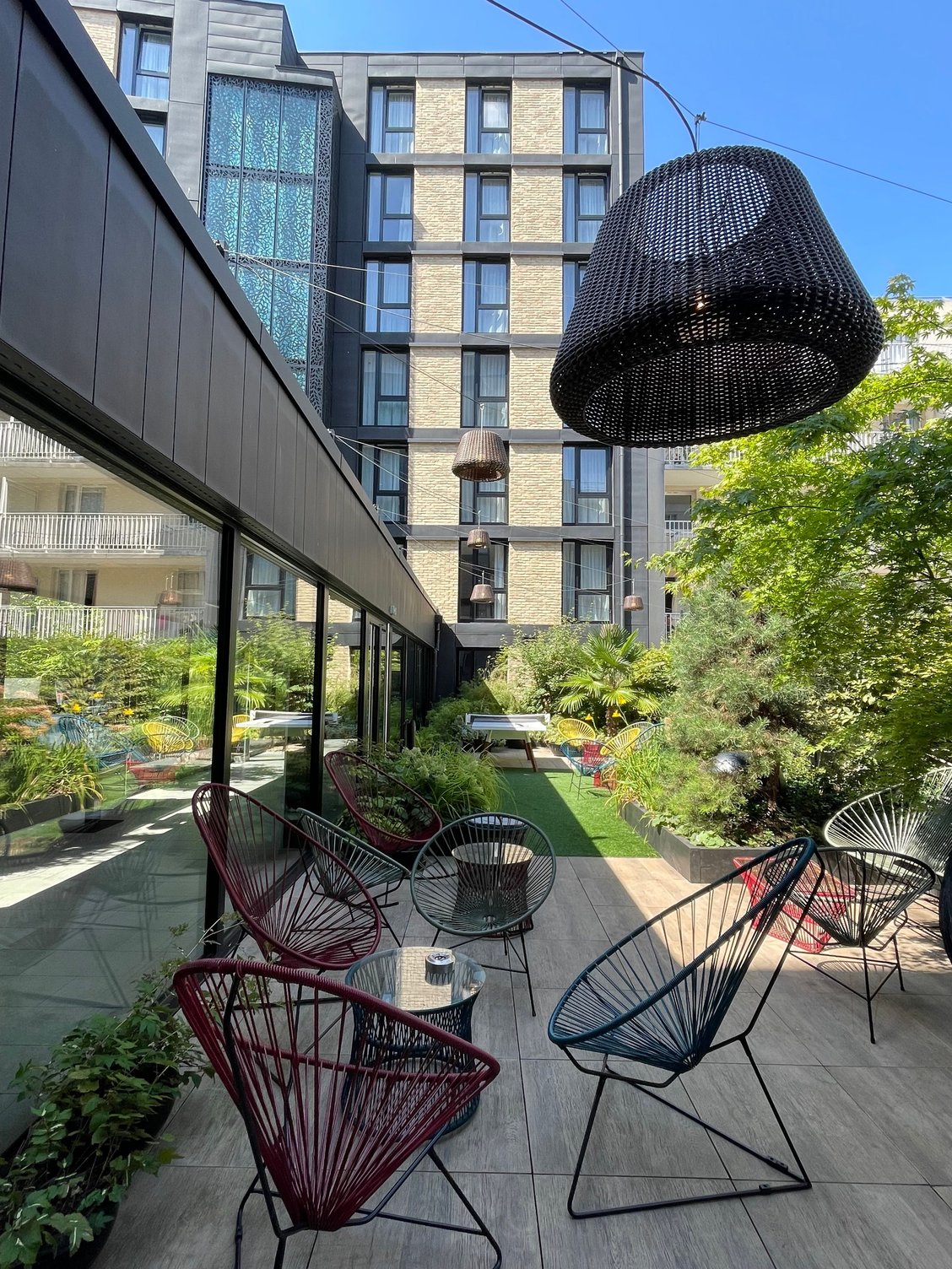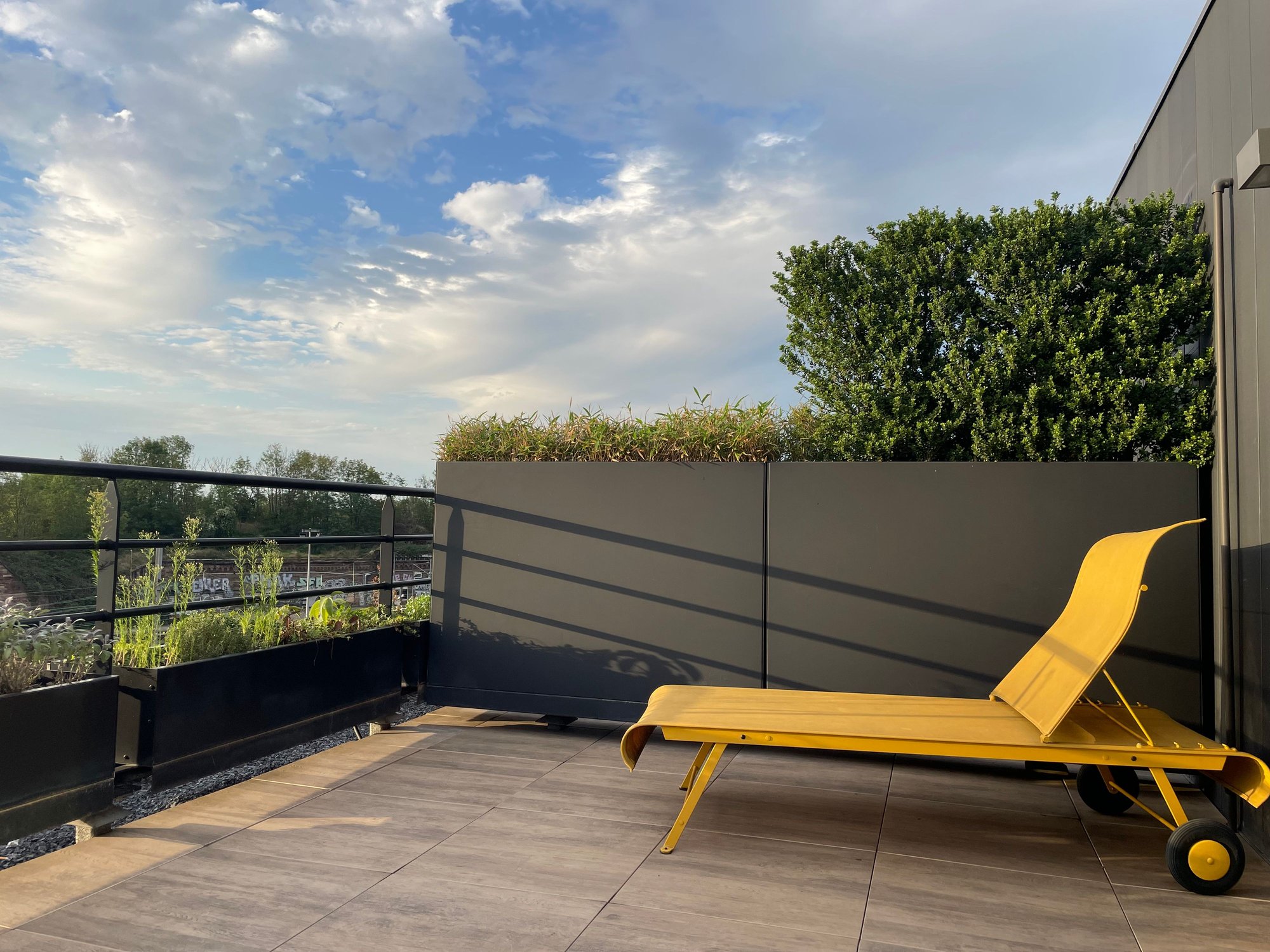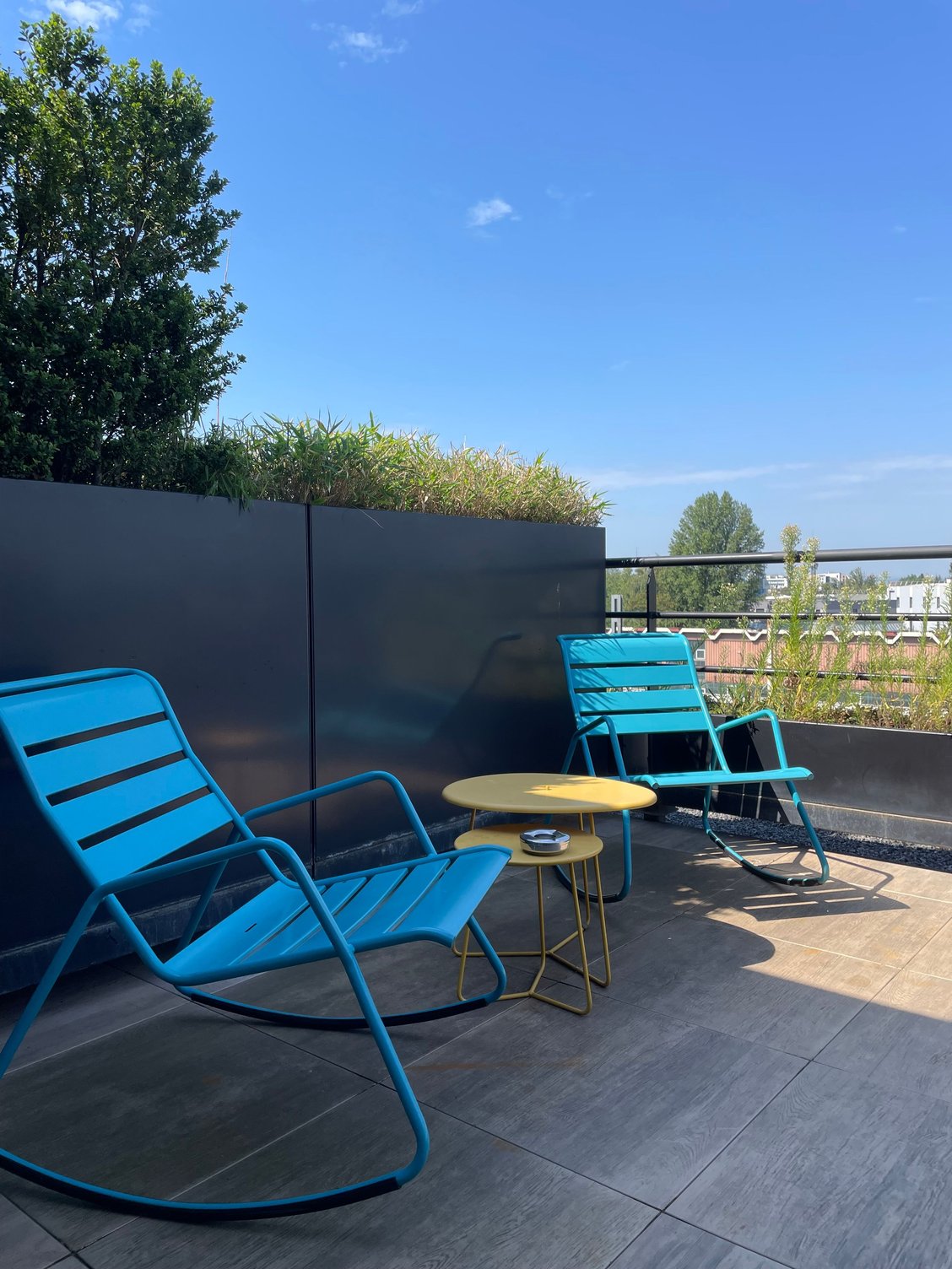 Large and leafy terrace, with chairs, coffee table and sun lounger.