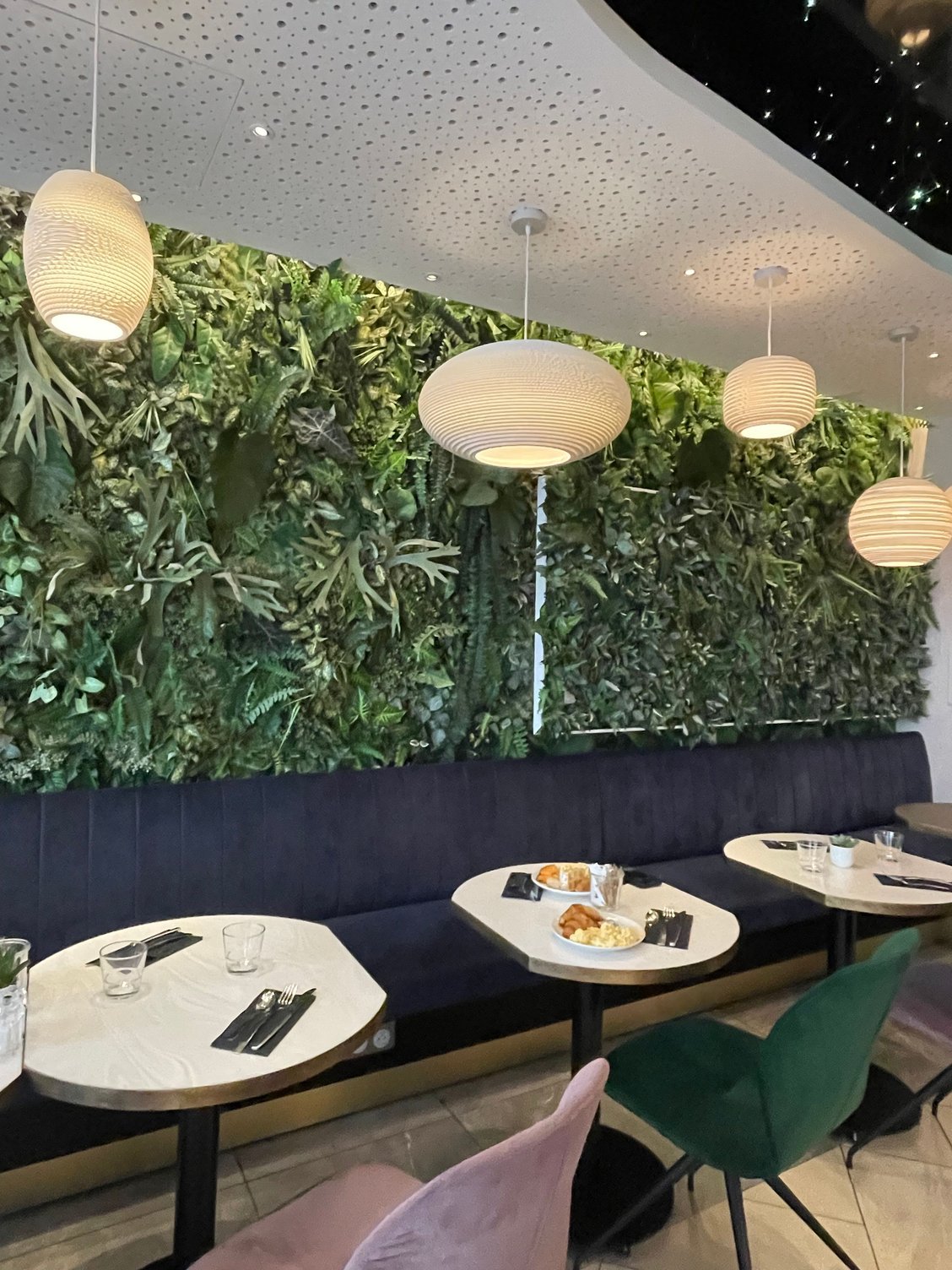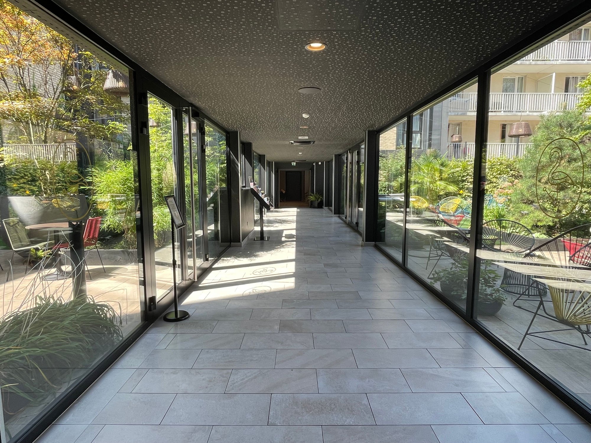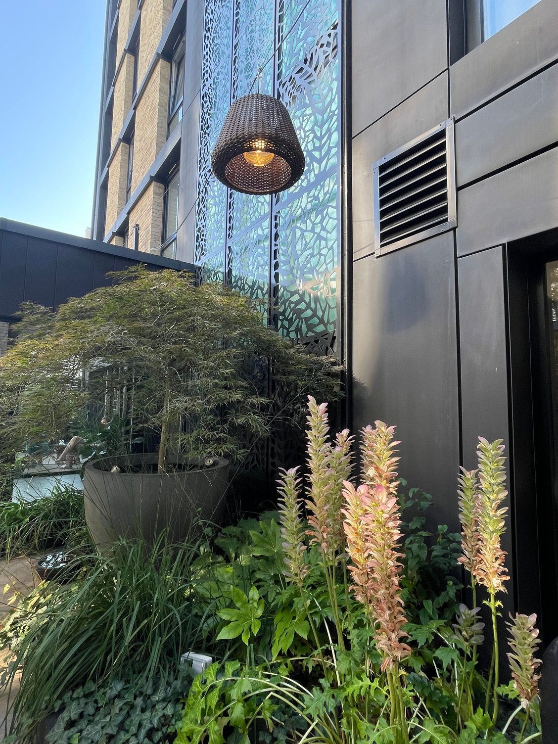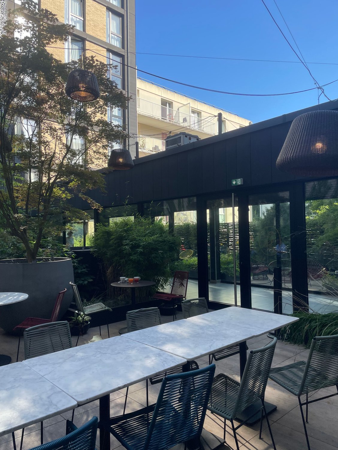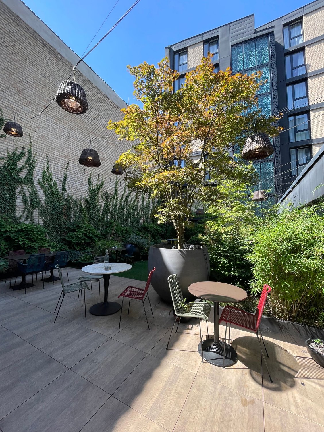 Large and leafy terrace, with chairs, coffee table and sun lounger.