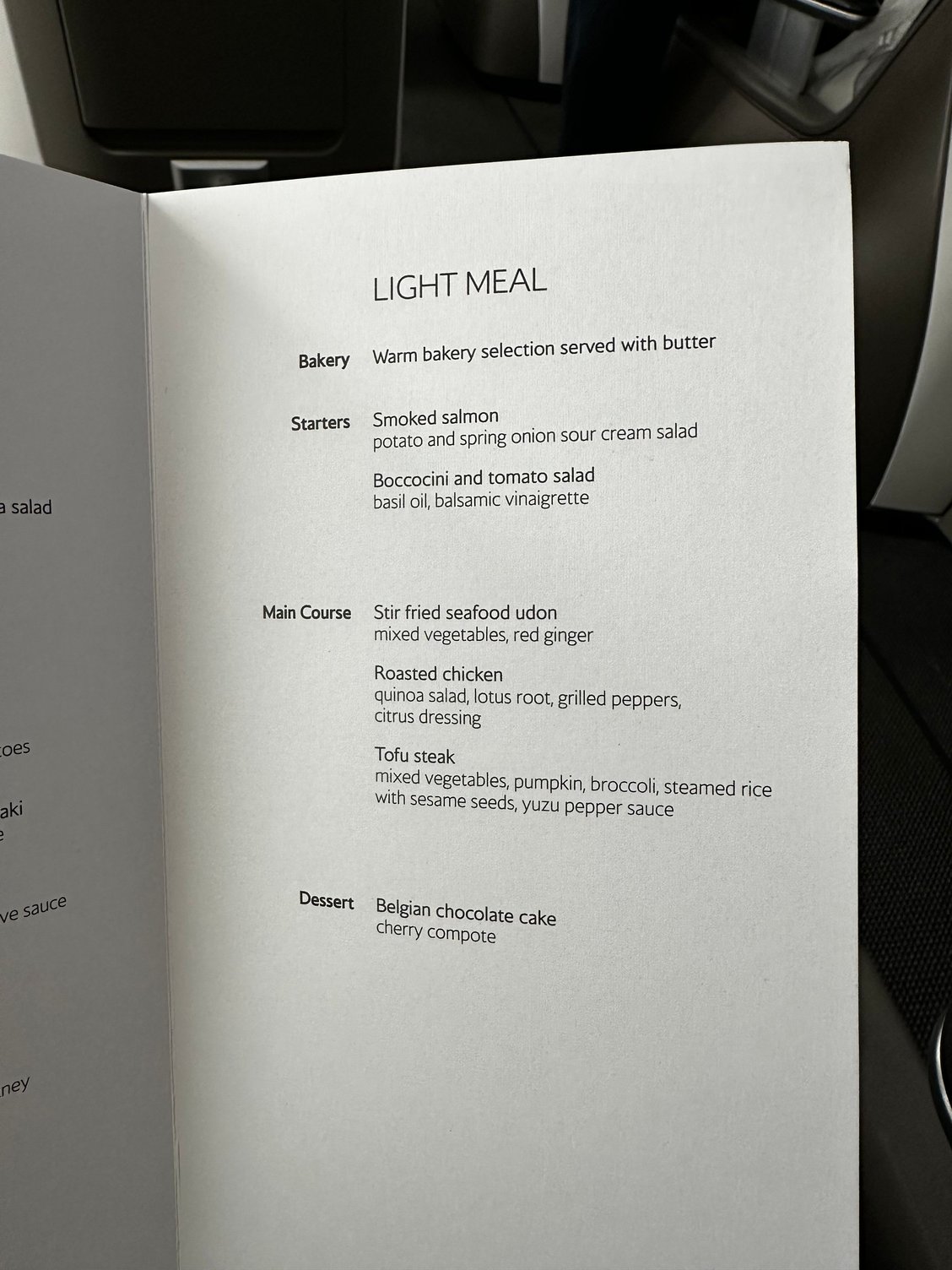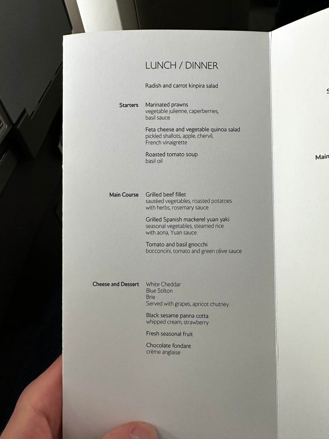 So, exactly the same menu yesterday. I was slightly worried as it was a full flight and I am not a fan of quinoa or tofu steak. Seated in row 13 though, I got all of my choices (tuna starter, beef main then for the light meal salad starter and udon main). All the staff serving the meals in our section were Japanese and the service was excellent and they were fast, faultlessly efficient and polite. I think it is the first time in a while that I haven't had to remind anyone about a forgotten drink order and I can't remember the last time in CW that someone offered to set up the bed for me!