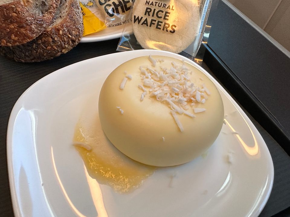Coconut mango mousse with toasted coconut and passionfruit gel