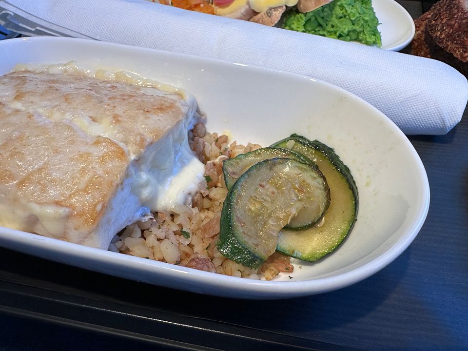 Pan-fried snapper fillet with pearl barley, red grapes and pistachios, roasted zucchini and preserved lemon labneh