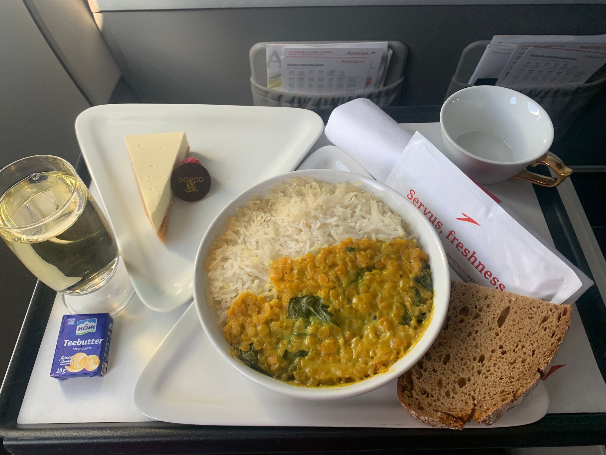 OS313 VIE-ARN at lunchtime, 2h10m block time, lacto-ovo vegetarian meal ordered (but this is probably vegan). Mildly spiced lentil curry and cheesecake. Rice around the edge of the bowl a little dry. Presentation could be improved immediately by using a fork to fluff the rice and curry which had been pressed flat by the foil lid.