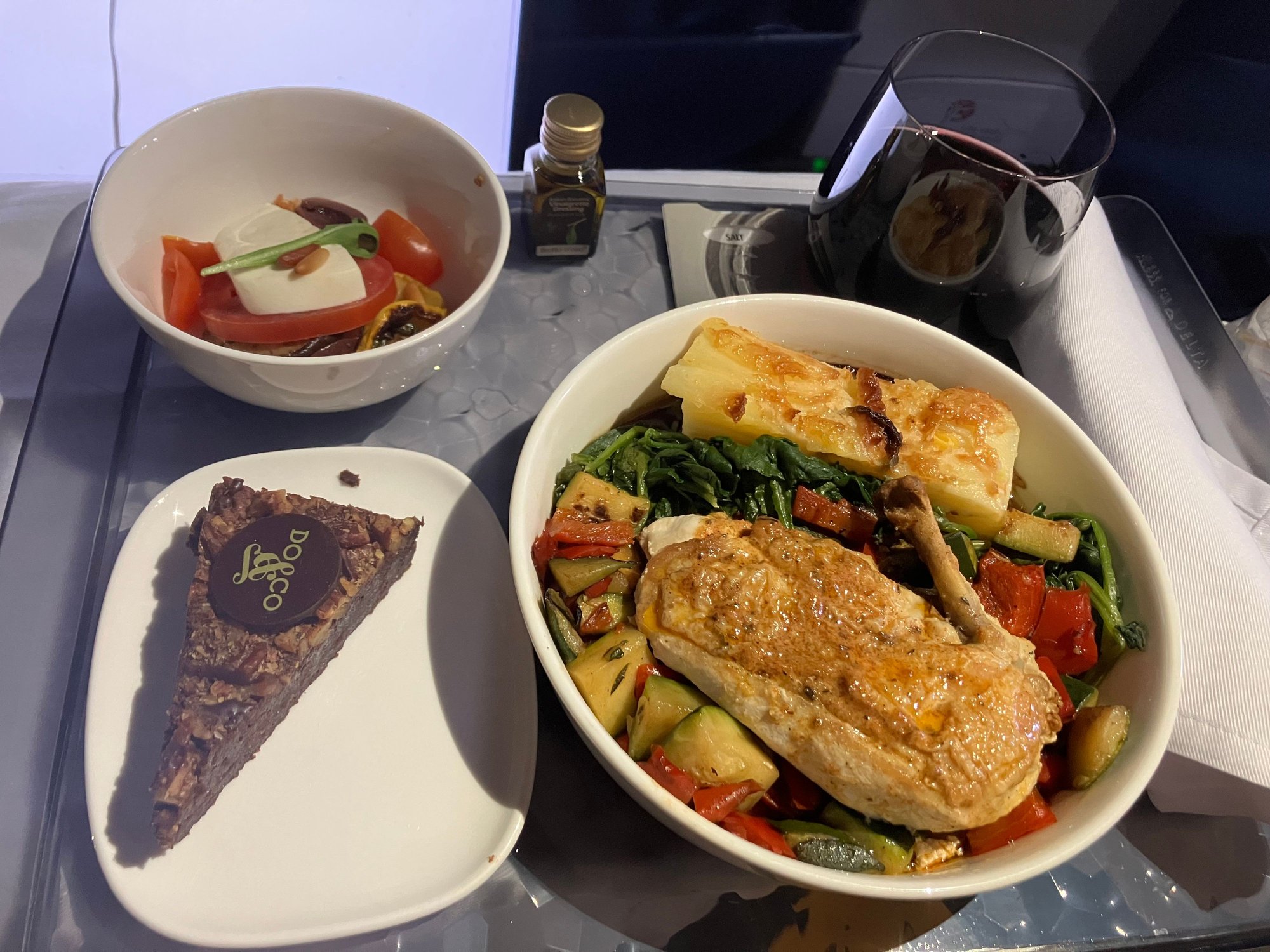 . I was in row 2 and orders were taken from the front but when she got to me there was no choice. However it was an excellent meal in every respect, including attentive service throughout the flight. The little caprese salad and slice of cake were delicious. We did not get any bread, but I don't know whether that is part of the service standard for a flight this length. Also, no hot towels, but again I don't know whether that is a thing on DL domestic. I have mostly flown AA for a number of years but I may need to rethink that. AA's meals on a similar length flight are a joke in comparison. AA's warm nuts are nice but they don't make up for all the other sins.