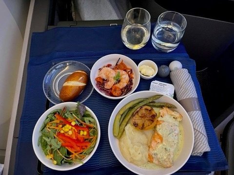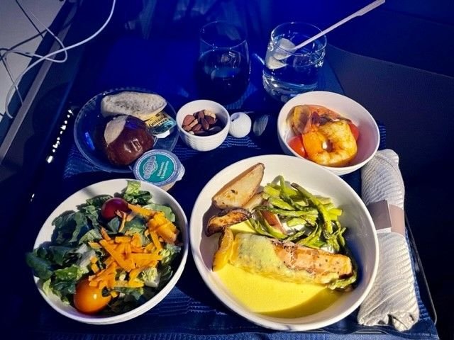 PDBs of sparkling wine or water were offered. Friendly and attentive crew who confirmed pre-order had been loaded and thanked for being a 1K. Opted for the salmon (actually both directions and wasn't disappointed), it was flavorful and substantial. Frequent refills until I passed out after dinner and sadly before sundae/dessert cart. I happily got 6+ hours of sleep so that made up for no sweets.
